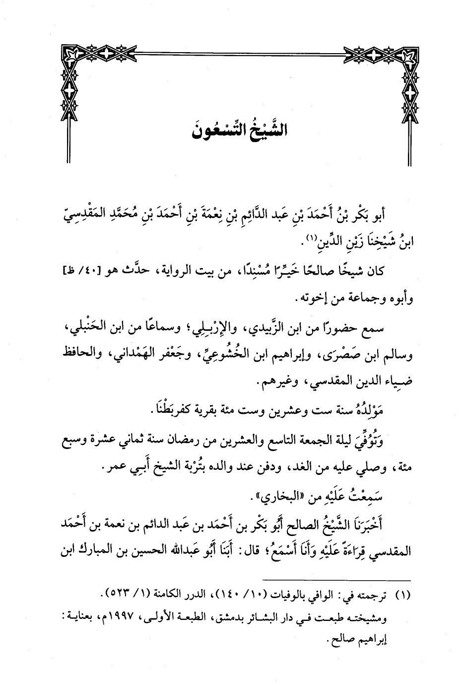 أخبرنا الشيخ الصالح أبو بكر بن أحمد بن عبد الدائم بن نعمة بن أحمد المقدسي قراءة عليه وأنا أسمع، قال: أبنا أبو عبد الله الحسين بن المبارك بن