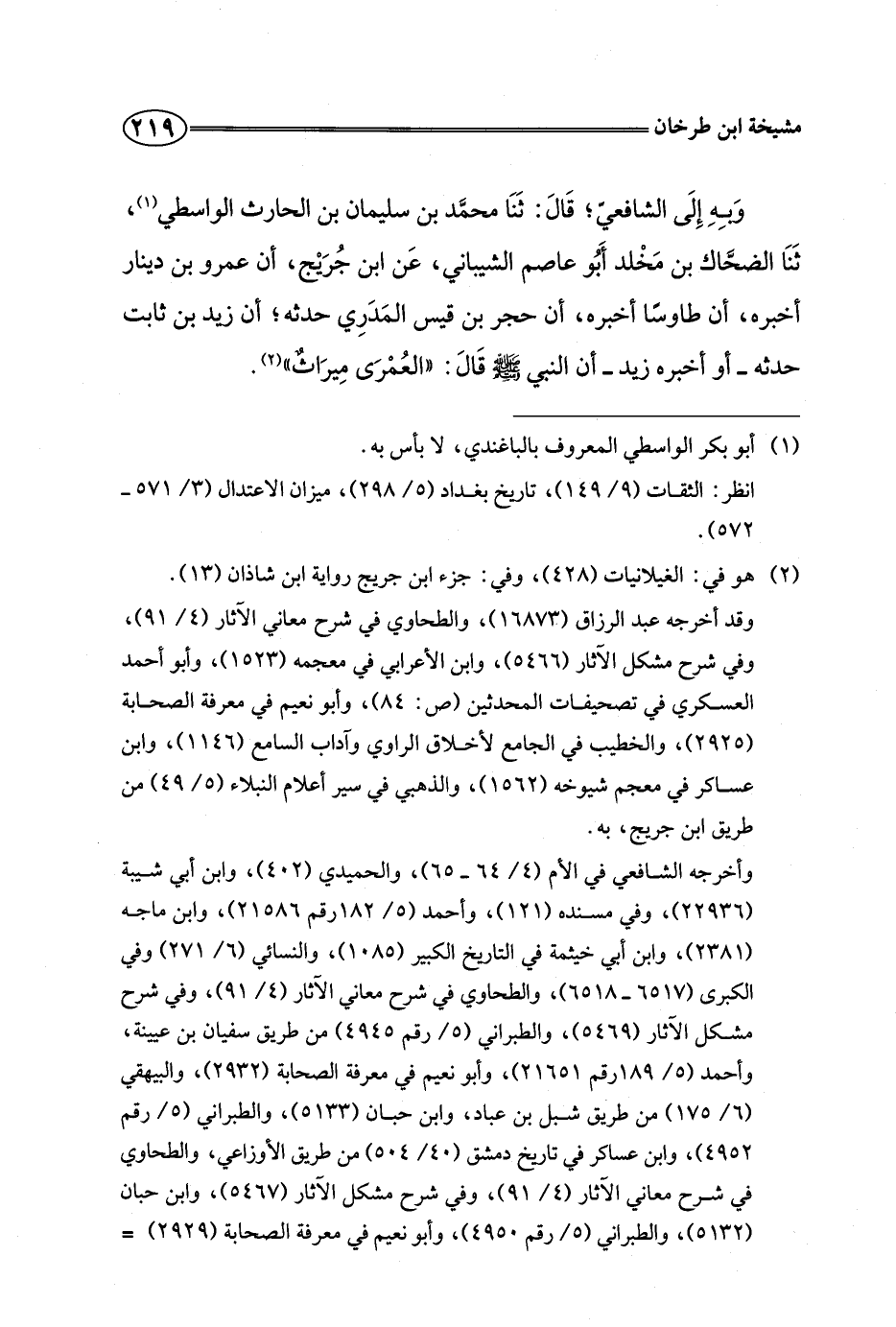 وبه إلى الشافعي، قال: ثنا محمد بن سليمان بن الحارث الواسطي، ثنا الضحاك بن مخلد أبو عاصم الشيباني، عن ابن جريج، أن عمرو بن دينار أخبره، أن طاوسا أخبره، أن حجر بن قيس المدري حدثه، أن زيد بن ثابت حدثه - أو أخبره زيد - أن النبي صلى الله عليه وسلم قال: "العمرى ميراث".