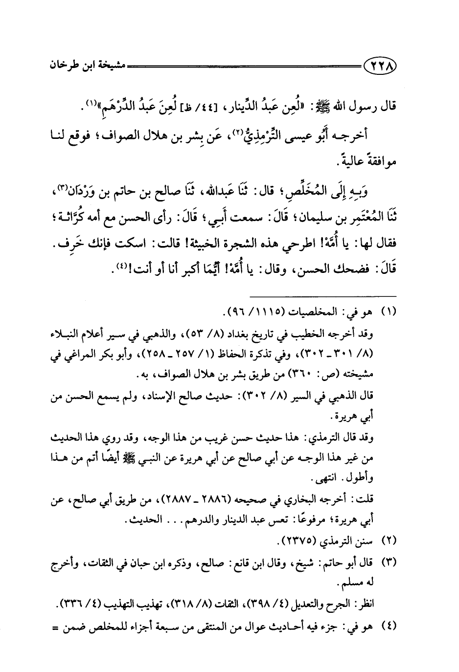 وبه إلى المخلص، قال: ثنا عبد الله، ثنا صالح بن حاتم بن وردان، ثنا المعتمر بن سليمان، قال: سمعت أبي، قال: رأى الحسن مع أمه كراثة، فقال لها: يا أمه! اطرحي هذه الشجرة الخبيثة! قالت: اسكت فإنك خرف قال: فضحك الحسن، وقال: يا أمة! أيما أكبر أنا أو أنت!.