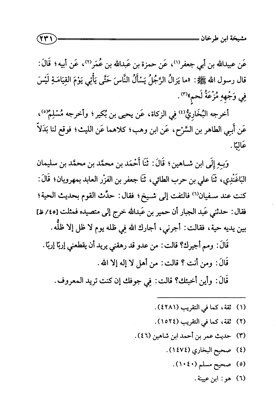 عن عبيد الله بن أبي جعفر، عن حمزة بن عبد الله بن عمر، عن أبيه، قال: قال رسول الله صلى الله عليه وسلم: "ما يزال الرجل يسأل الناس حتى يأتي يوم القيامة ليس في وجهه مزعة لحم".