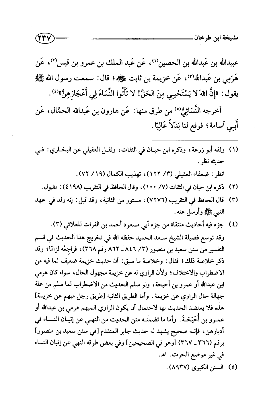عبيد الله بن عبد الله بن الحصين، عن عبد الملك بن عمرو بن قيس، عن هرمي بن عبد الله، عن خزيمة بن ثابت رضي الله عنه، قال: سمعت رسول الله صلى الله عليه وسلم يقول: "إن الله لا يستحيي من الحق! لا تأتوا النساء في أعجازهن".
