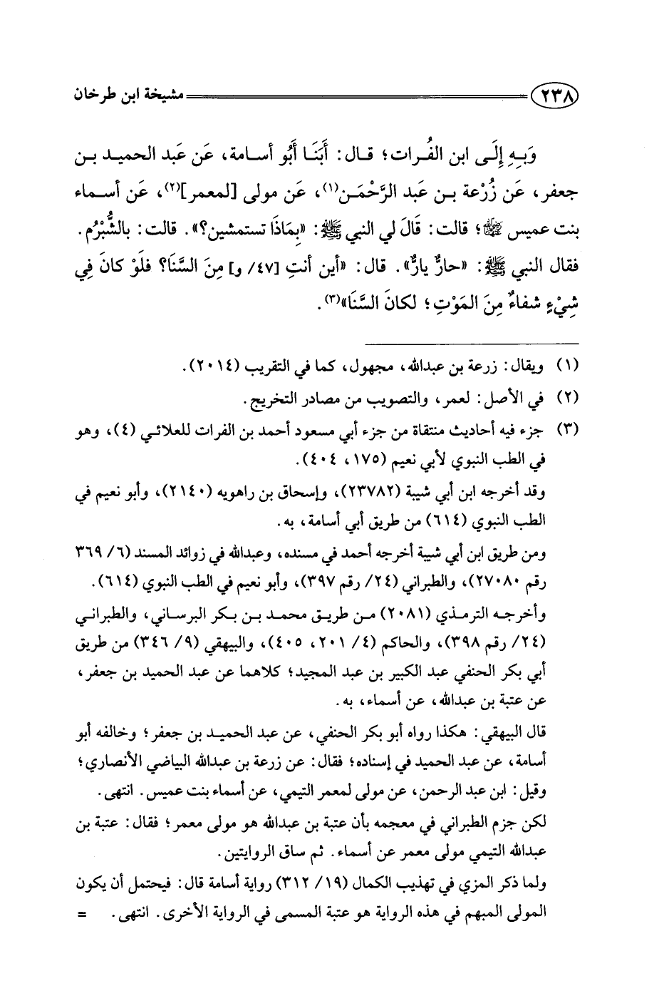 وبه إلى ابن الفرات، قال: أبنا أبو أسامة، عن عبد الحميد بن جعفر، عن زرعة بن عبد الرحمن، عن مولى [لمعمر]، عن أسماء بنت عميس رضي الله عنها، قالت: قال لي النبي صلى الله عليه وسلم: "بماذا تستمشين؟ ". قالت: بالشبرم. فقال النبي صلى الله عليه وسلم: "حار يار". قال: "أين أنت من السنا؟ فلو كان في شيء شفاء من الموت، لكان السنا".