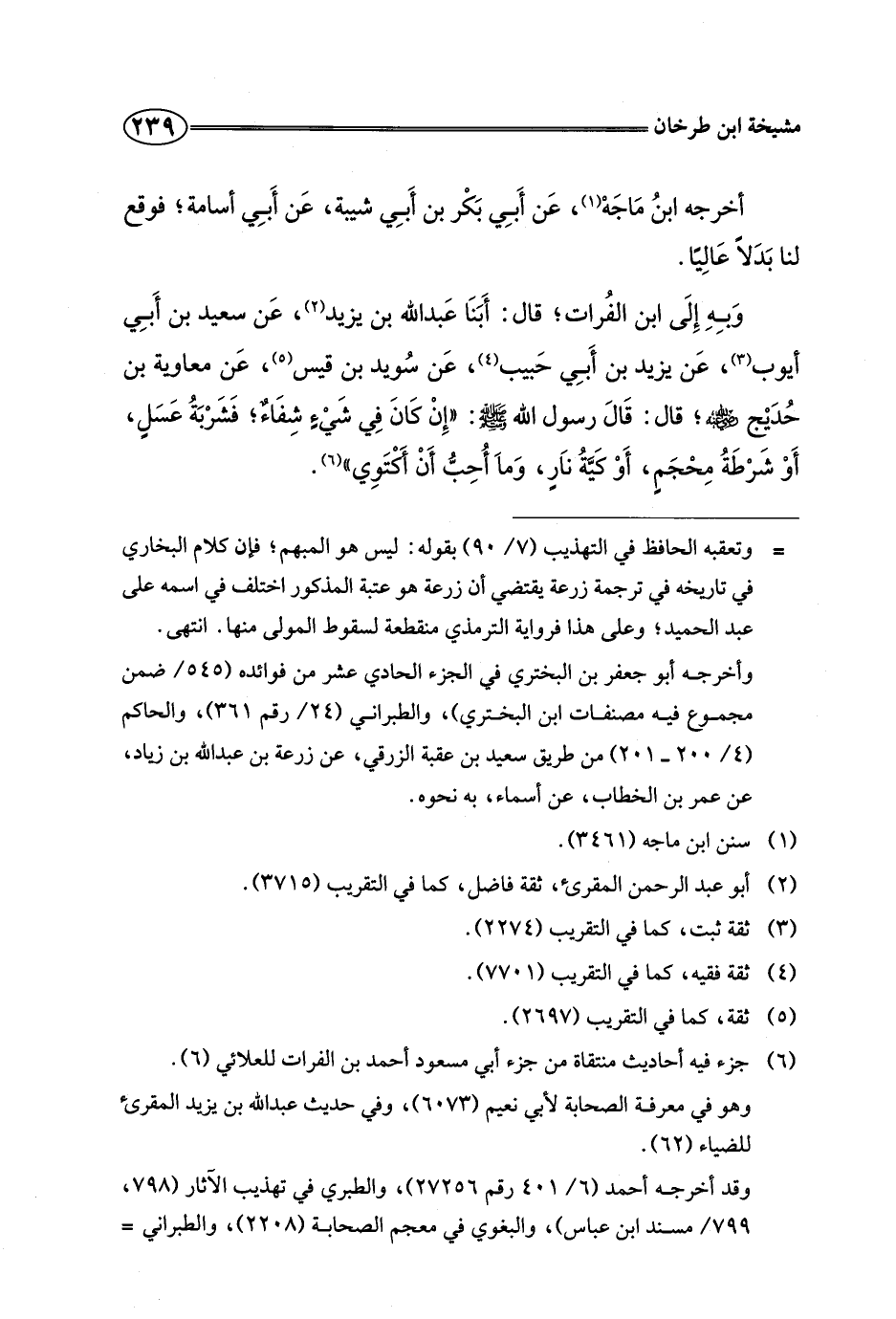 وبه إلى ابن الفرات، قال: أبنا عبد الله بن يزيد، عن سعيد بن أبي أيوب، عن يزيد بن أبي حبيب، عن سويد بن قيس، عن معاوية بن حديج رضي الله عنه، قال: قال رسول الله صلى الله عليه وسلم: "إن كان في شيء شفاء، فشربة عسل، أو شرطة محجم، أو كية نار، وما أحب أن أكتوي".