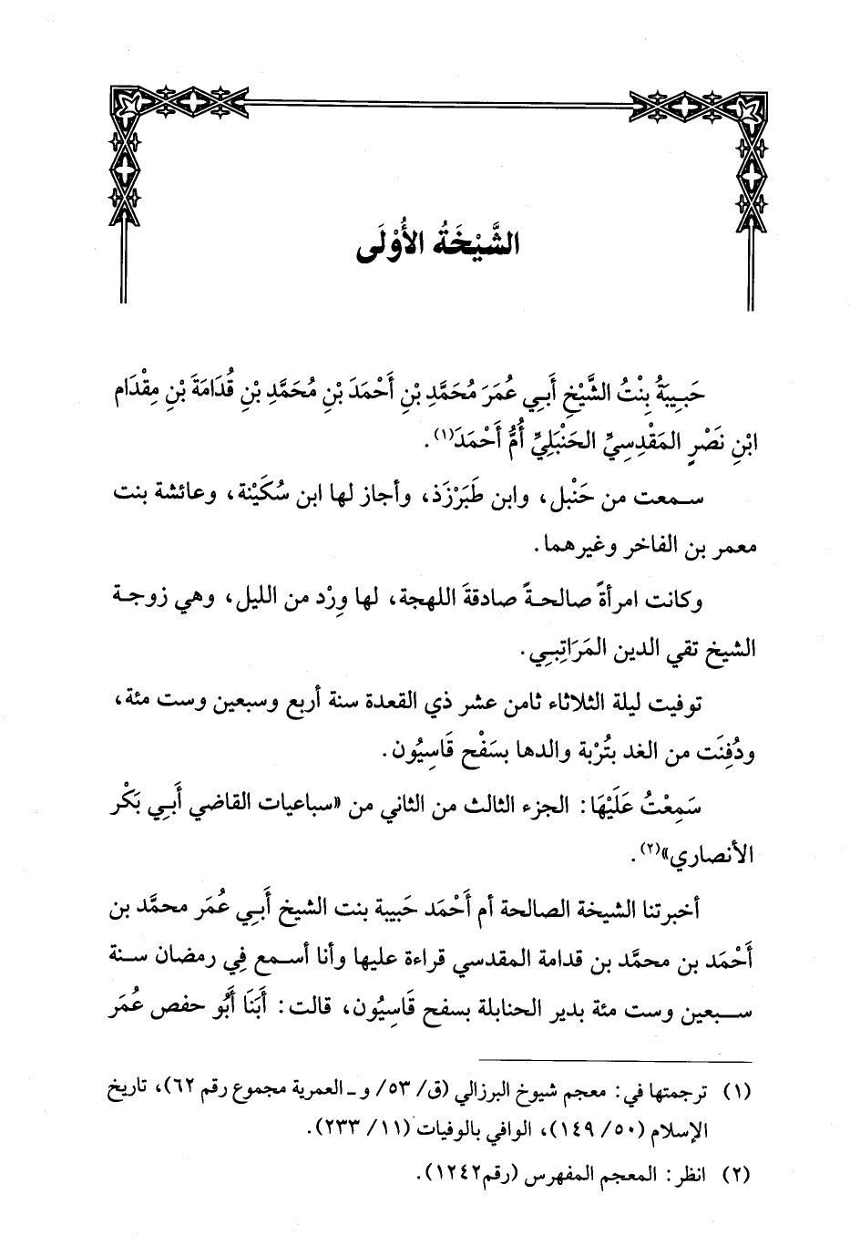 أخبرتنا الشيخة الصالحة أم أحمد حبيبة بنت الشيخ أبي عمر محمد بن أحمد بن محمد بن قدامة المقدسي قراءة عليها وأنا أسمع في رمضان سنة سبعين وست مئة بدير الحنابلة بسفح قاسيون، قالت: أبنا أبو حفص عمر