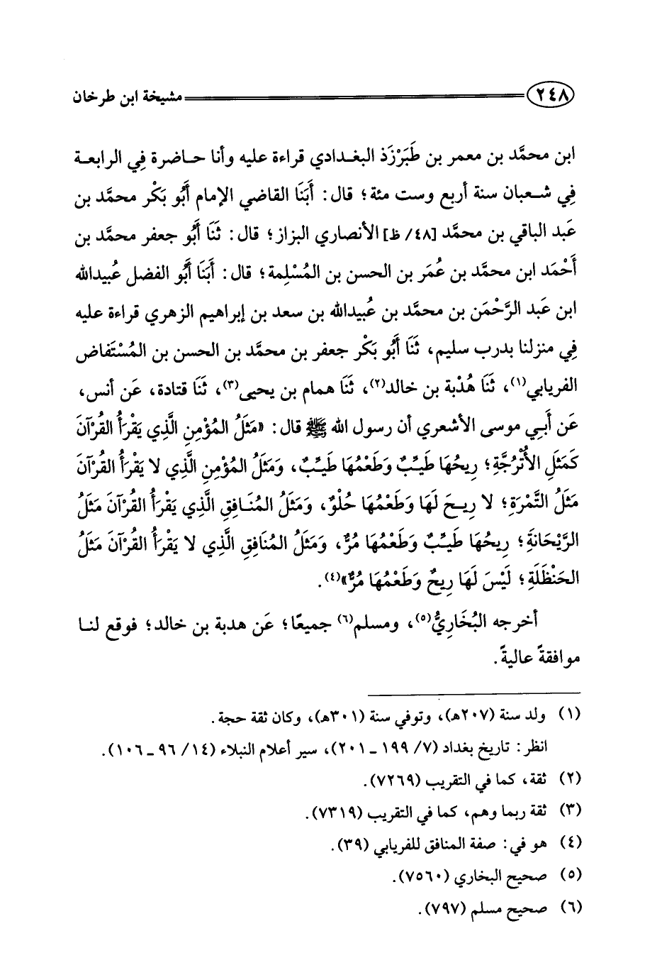 ابن محمد بن معمر بن طبرزد البغدادي قراءة عليه وأنا حاضرة في الرابعة في شعبان سنة أربع وست مئة، قال: أبنا القاضي الإمام أبو بكر محمد بن عبد الباقي بن محمد الأنصاري البزاز، قال: ثنا أبو جعفر محمد بن أحمد بن محمد بن عمر بن الحسن بن المسلمة، قال: أبنا أبو الفضل عبيد الله بن عبد الرحمن بن محمد بن عبيد الله بن سعد بن إبراهيم الزهري قراءة عليه في منزلنا بدرب سليم، ثنا أبو بكر جعفر بن محمد بن الحسن بن المستفاض الفريابي، ثنا هدبة بن خالد، ثنا همام بن يحيى، ثنا قتادة، عن أنس، عن أبي موسى الأشعري أن رسول الله صلى الله عليه وسلم قال: "مثل المؤمن الذي يقرأ القرآن كمثل الأترجة، ريحها طيب وطعمها طيب، ومثل المؤمن الذي لا يقرأ القرآن مثل التمرة، لا ريح لها وطعمها حلو، ومثل المنافق الذي يقرأ القرآن مثل الريحانة، ريحها طيب وطعمها مر، ومثل المنافق الذي لا يقرأ القرآن مثل الحنظلة، ليس لها ريح وطعمها مر".