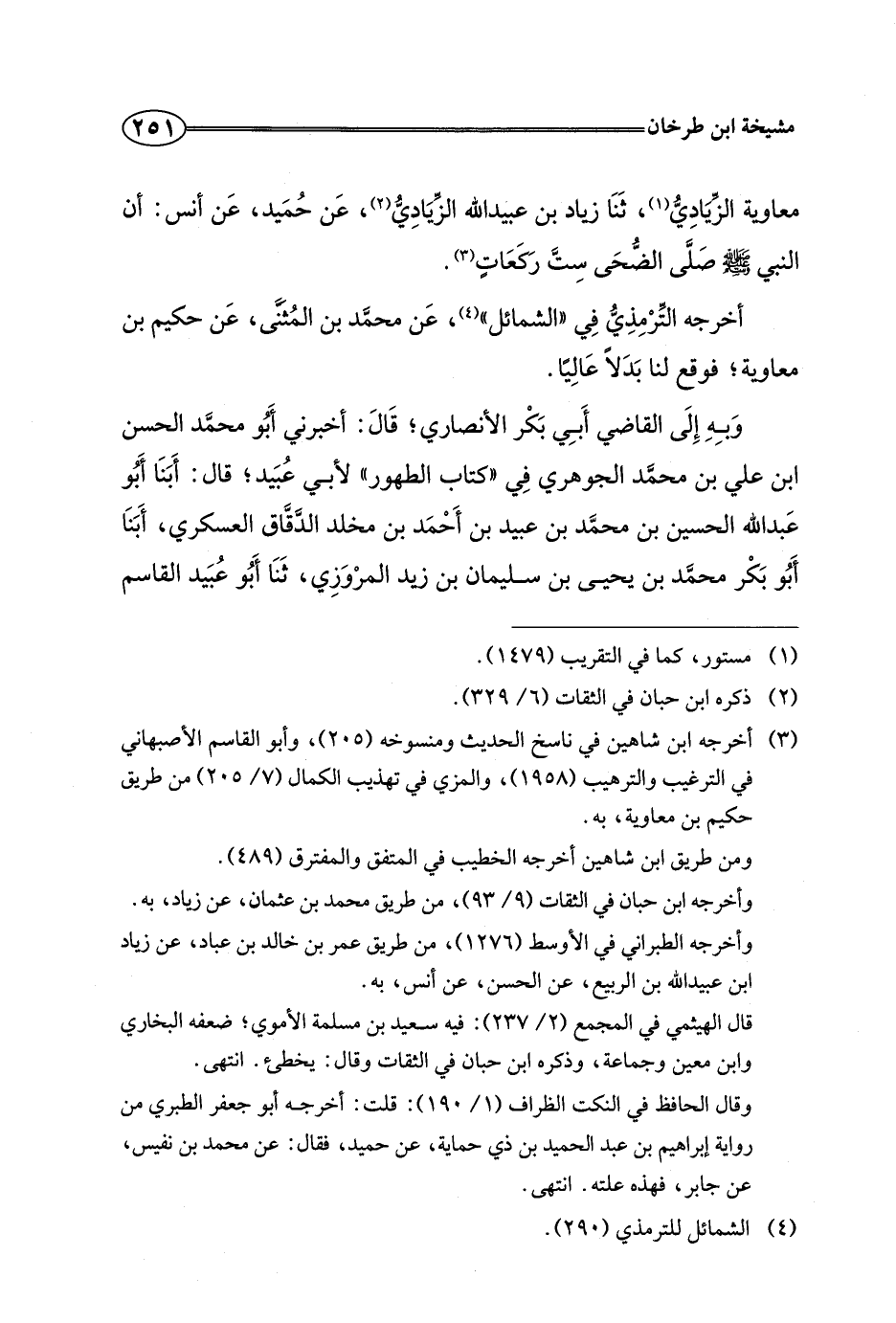 معاوية الزيادي، ثنا زياد بن عبيد الله الزيادي، عن حميد، عن أنس: أن النبي صلى الله عليه وسلم صلى الضحى ست ركعات.