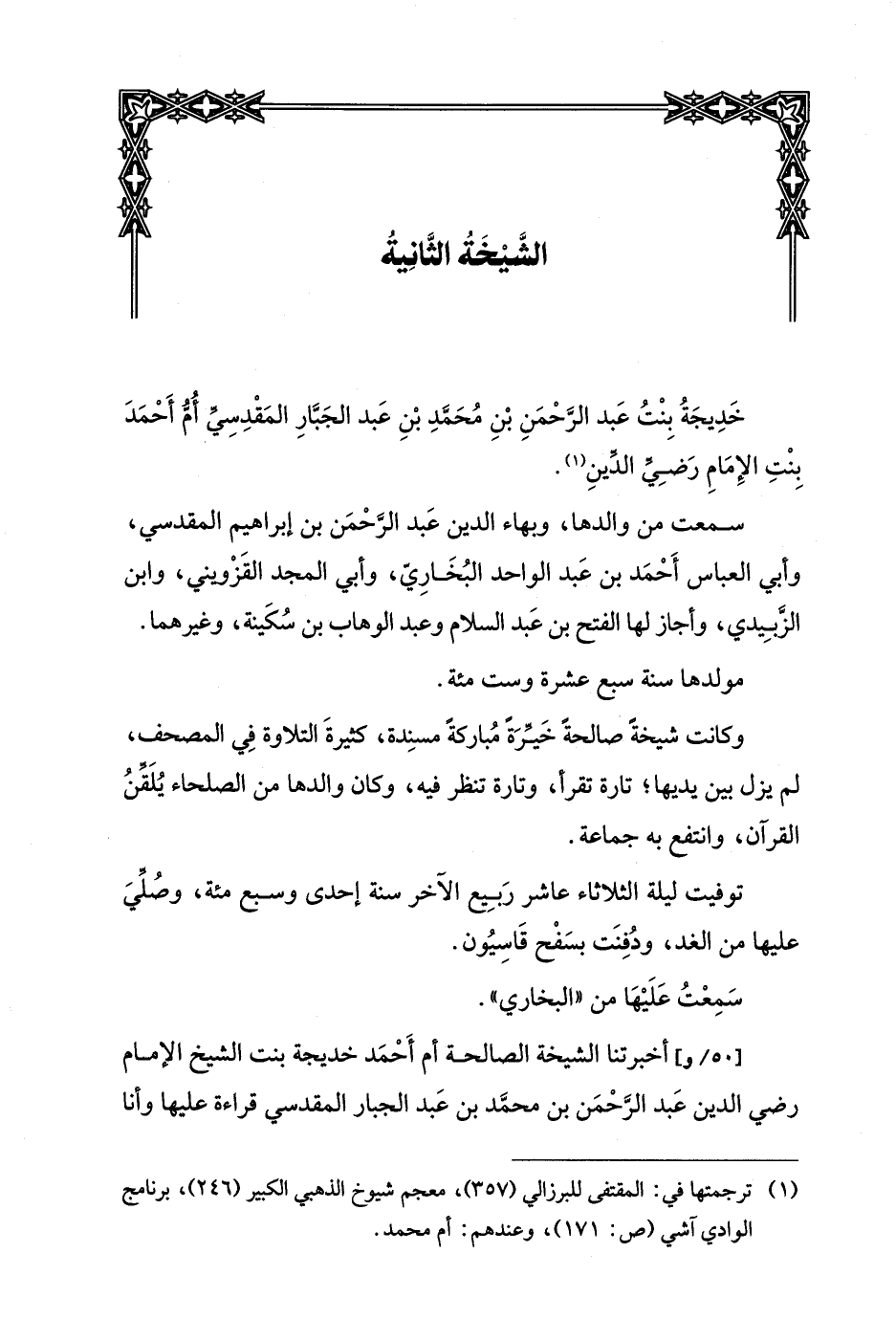 وأخبرتنا الشيخة الصالحة أم أحمد خديجة بنت الشيخ الإمام رضي الدين عبد الرحمن بن محمد بن عبد الجبار المقدسي قراءة عليها وأنا