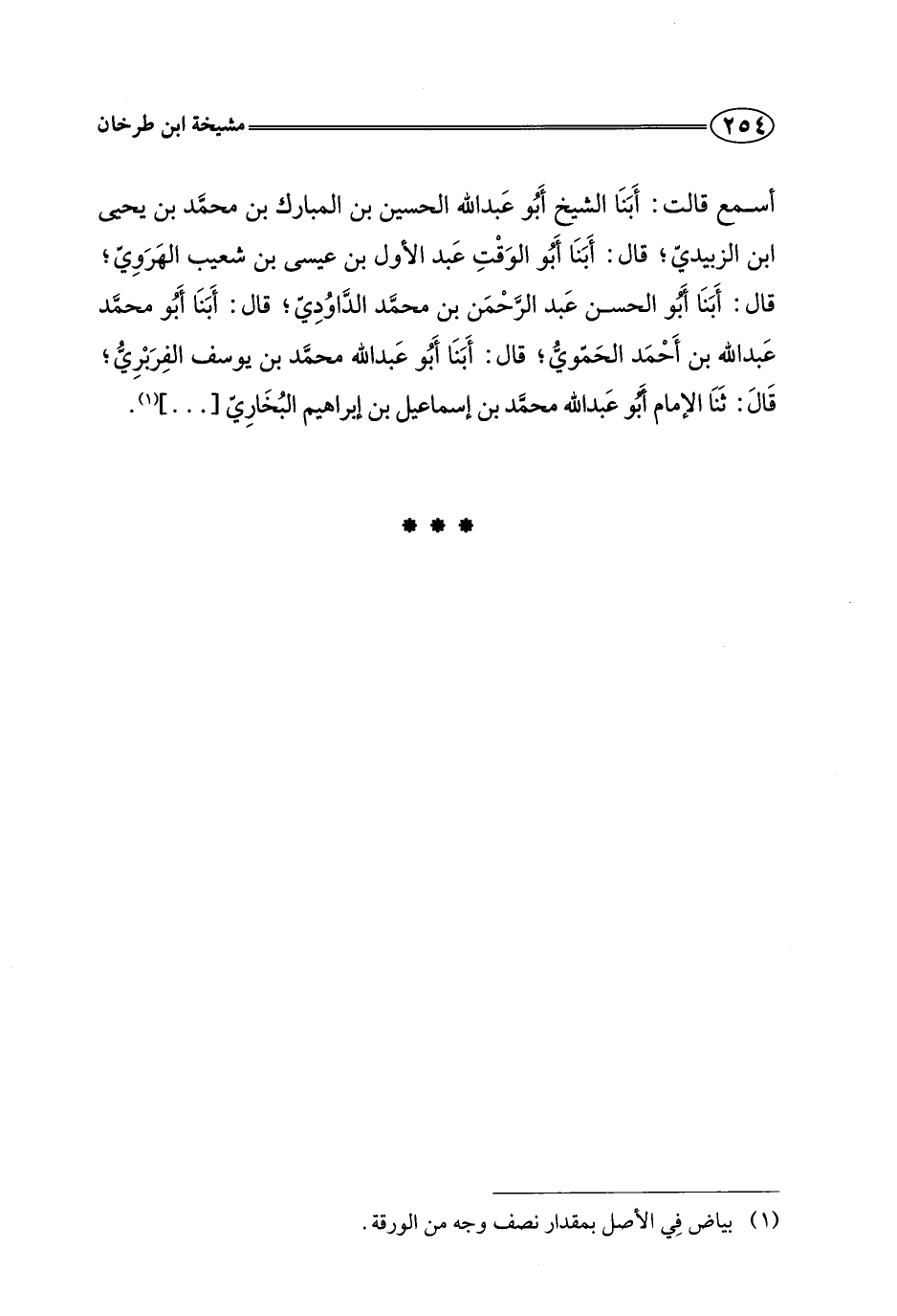 أسمع قالت: أبنا الشيخ أبو عبد الله الحسين بن المبارك بن محمد بن يحيى بن الزبيدي، قال: أبنا أبو الوقت عبد الأول بن عيسى بن شعيب الهروي، قال: أبنا أبو الحسن عبد الرحمن بن محمد الداودي، قال: أبنا أبو محمد عبد الله بن أحمد الحموي، قال: أبنا أبو عبد الله محمد بن يوسف الفربري، قال: ثنا الإمام أبو عبد الله محمد بن إسماعيل بن إبراهيم البخاري [ ..... ].