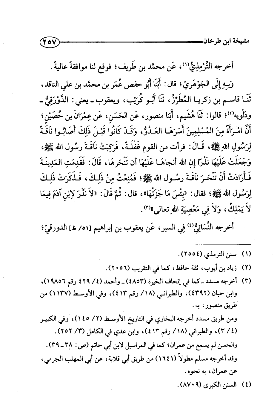 وبه إلى الجوهري، قال: أبنا أبو حفص عمر بن محمد بن علي الناقد، ثنا قاسم بن زكريا المطرز، ثنا أبو كريب، ويعقوب - يعني: الدورقي - ودلويه، قالوا: ثنا هشيم، أبنا منصور، عن الحسن، عن عمران بن حصين، أن امرأة من المسلمين أسرها العدو، وقد كانوا قبل ذلك أصابوا ناقة لرسول الله صلى الله عليه وسلم، قال: فرأت من القوم غفلة، فركبت ناقة رسول الله صلى الله عليه وسلم، وجعلت عليها نذرا إن الله أنجاها عليها أن تنحرها، قال: فقدمت المدينة فأرادت أن تنحر ناقة رسول الله صلى الله عليه وسلم، فمنعت من ذلك، فذكرت ذلك لرسول الله صلى الله عليه وسلم، فقال: "بئس ما جزتها"، قال: ثم قال: "لا نذر لابن آدم فيما لا يملك، ولا في معصية الله تعالى".