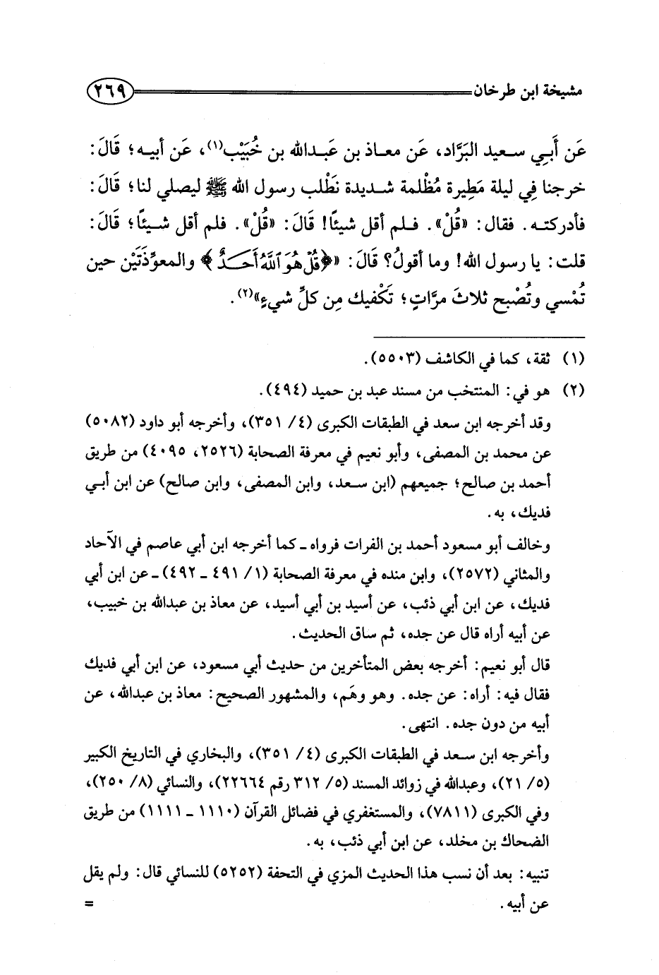 عن أبي سعيد البراد، عن معاذ بن عبد الله بن خبيب، عن أبيه، قال: خرجنا في ليلة مطيرة مظلمة شديدة نطلب رسول الله صلى الله عليه وسلم ليصلي لنا، قال: فأدركته. فقال: "قل". فلم أقل شيئا! قال: "قل". فلم أقل شيئا، قال: قلت: يا رسول الله! وما أقول؟ قال: " {قل هو الله أحد} والمعوذتين حين تمسي وتصبح ثلاث مرات، تكفيك من كل شيء".