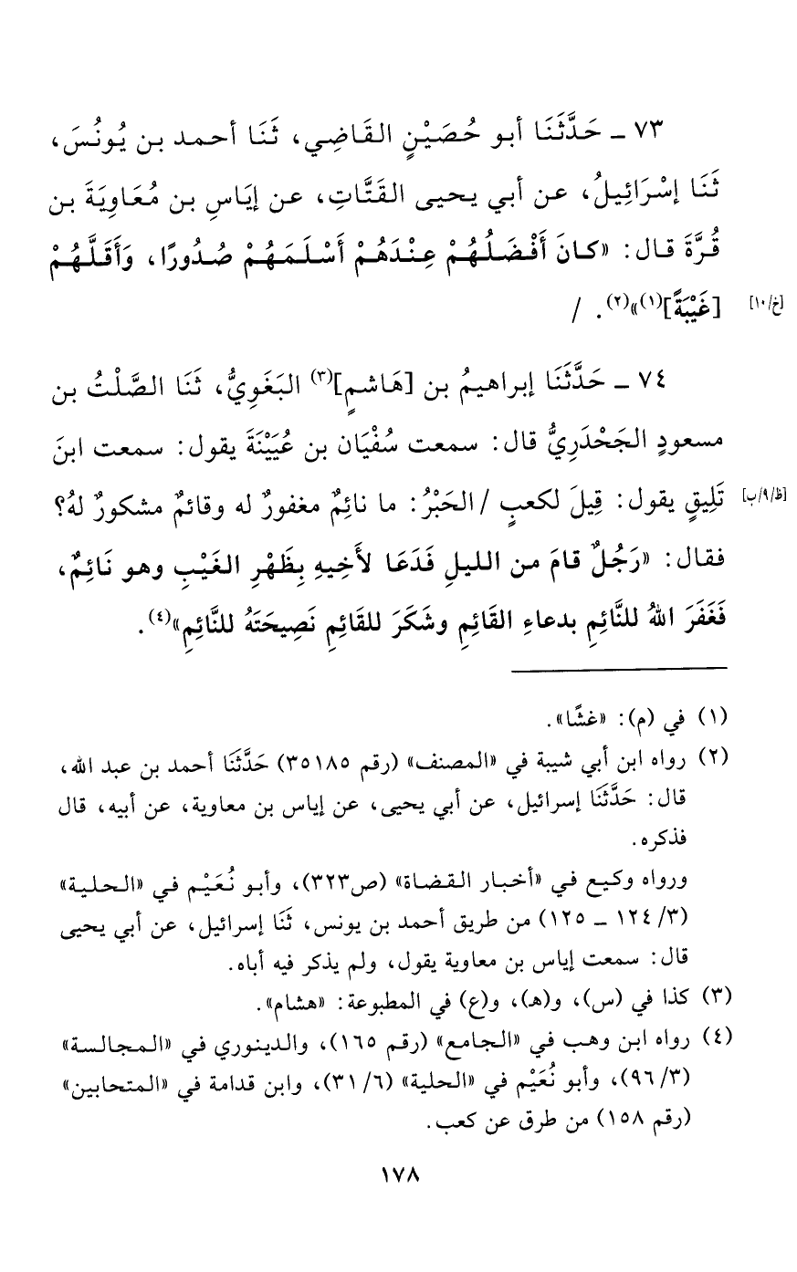 74 - حَدَّثَنَا إِبْرَاهِيمُ بْنُ هاشم الْبَغَوِيُّ، حَدَّثَنَا الصَّلْتُ بْنُ مَسْعُودٍ الْجَحْدَرِيُّ قَالَ: سَمِعْتُ سُفْيَانَ بْنَ عُيَيْنَةَ يَقُولُ: سَمِعْتُ ابْنَ تَلِيقٍ يَقُولُ: قِيلَ لِكَعْبٍ الْحَبْرُ: مَا نَائِمٌ مَغْفُورٌ لَهُ وَقَائِمٌ مَشْكُورٌ لَهُ؟ فَقَالَ: "رَجُلٌ قَامَ مِنَ اللَّيْلِ فَدَعَا لِأَخِيهِ بِظَهْرِ الْغَيْبِ وَهُوَ نَائِمٌ، فَغَفَرَ اللَّهُ لِلنَّائِمِ بِدُعَاءِ الْقَائِمِ وَشَكَرَ لِلْقَائِمِ نَصِيحَتَهُ لِلنَّائِمِ".