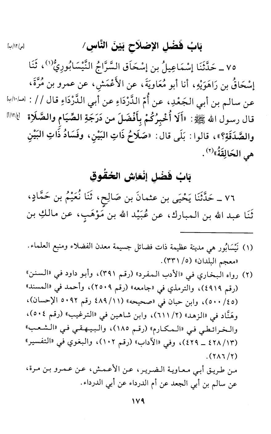 75 - حَدَّثَنَا إِسْمَاعِيلُ بْنُ إِسْحَاقَ السَّرَّاجُ النَّيْسَابُورِيُّ، حَدَّثَنَا إِسْحَاقُ بْنُ رَاهَوَيْهِ، أنا أَبُومُعَاوِيَةَ، عَنِ الْأَعْمَشِ، عَنْ عَمْرِو بْنِ مُرَّةَ، عَنْ سَالِمِ بْنِ أَبِي الْجَعْدِ، عَنْ أم الدرداء عن أَبِي الدَّرْدَاءِ قَالَ: قَالَ رَسُولُ اللَّهِ صَلَّى اللَّهُ عَلَيْهِ وَسَلَّمَ: "أَلَا أُخْبِرُكُمْ بِأَفْضَلَ مِنْ دَرَجَةِ الصِّيَامِ وَالصَّلَاةِ وَالصَّدَقَةِ؟ "، قَالُوا: بَلَى قَالَ: "صَلَاحُ ذَاتِ الْبَيْنِ، وَفَسَادُ ذَاتِ الْبَيْنِ هِيَ الْحَالِقَةُ".