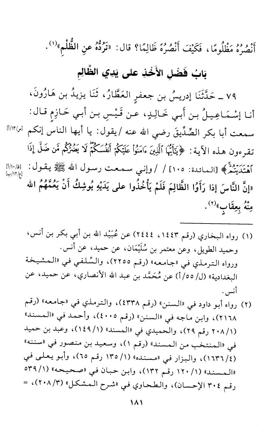 79 - حَدَّثَنَا إِدْرِيسُ بْنُ جَعْفَرٍ الْعَطَّارُ، حَدَّثَنَا يَزِيدُ بْنُ هَارُونَ، أنا إِسْمَاعِيلُ بْنُ أَبِي خَالِدٍ، عَنْ قَيْسِ بْنِ أَبِي حَازِمٍ قَالَ: سَمِعْتُ أَبَا بَكْرٍ الصِّدِّيقَ - رضي الله عنه - يَقُولُ: يَا أَيُّهَا النَّاسُ إِنَّكُمْ تْقَرَؤُونَ هَذِهِ الْآيَةَ {يَا أَيُّهَا الَّذِينَ آمَنُوا عَلَيْكُمْ أَنْفُسَكُمْ لَا يَضُرُّكُمُ مَنْ ضَلَّ إِذَا اهْتَدَيْتُمْ} [المائدة: 105] وَإِنِّي سَمِعْتُ رَسُولَ اللَّهِ صَلَّى اللَّهُ عَلَيْهِ وَسَلَّمَ يَقُولُ: "إِنَّ النَّاسَ إِذَا رَأَوُا الظَّالِمَ فَلَمْ يَأْخُذُوا عَلَى يَدَيْهِ يُوشِكُ أَنْ يَعُمَّهُمُ اللَّهُ مِنْهُ بِعِقَابٍ".