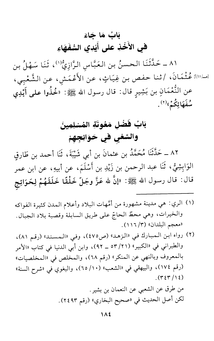 81 - حَدَّثَنَا الْحَسَنُ بْنُ الْعَبَّاسِ الرَّازِيُّ، حَدَّثَنَا سَهْلُ بْنُ عُثْمَانَ، حَدَّثَنَا حَفْصُ بْنُ غِيَاثٍ، عَنِ الْأَعْمَشِ، عَنِ الشَّعْبِيِّ، عَنِ النُّعْمَانِ بْنِ بَشِيرٍ قَالَ: قَالَ رَسُولُ اللَّهِ صَلَّى اللَّهُ عَلَيْهِ وَسَلَّمَ: "خُذُوا عَلَى أَيْدِي سُفَهَائِكُمْ".