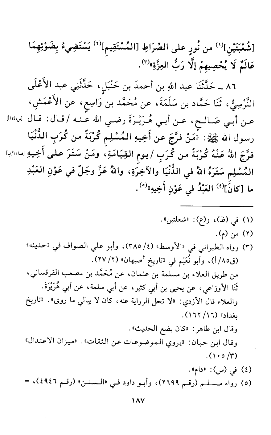 86 - حَدَّثَنَا عَبْدُ اللَّهِ بْنُ أَحْمَدَ بْنِ حَنْبَلٍ، حدثني عَبْدُ الْأَعْلَى النَّرْسِيُّ، حَدَّثَنَا حَمَّادُ بْنُ سَلَمَةَ، عَنْ مُحَمَّدِ بْنِ وَاسِعٍ، عَنِ الْأَعْمَشِ، عَنْ أَبِي صَالِحٍ، عَنْ أَبِي هُرَيْرَةَ - رضي الله عنه - قَالَ: قَالَ رَسُولُ اللَّهِ صَلَّى اللَّهُ عَلَيْهِ وَسَلَّمَ: "مَنْ فَرَّجَ عَنْ أَخِيهِ الْمُسْلِمِ كُرْبَةً مِنْ كُرَبِ الدُّنْيَا فَرَّجَ اللَّهُ عَنْهُ كُرْبَةً مِنْ كُرَبِ يَوْمِ الْقِيَامَةِ، وَمَنْ سَتَرَ عَلَى أَخِيهِ الْمُسْلِمِ سَتَرَهُ اللَّهُ فِي الدُّنْيَا وَالْآخِرَةِ، وَاللَّهُ عَزَّ وَجَلَّ فِي عَوْنِ الْعَبْدِ مَا كان الْعَبْدُ فِي عَوْنِ أَخِيهِ".