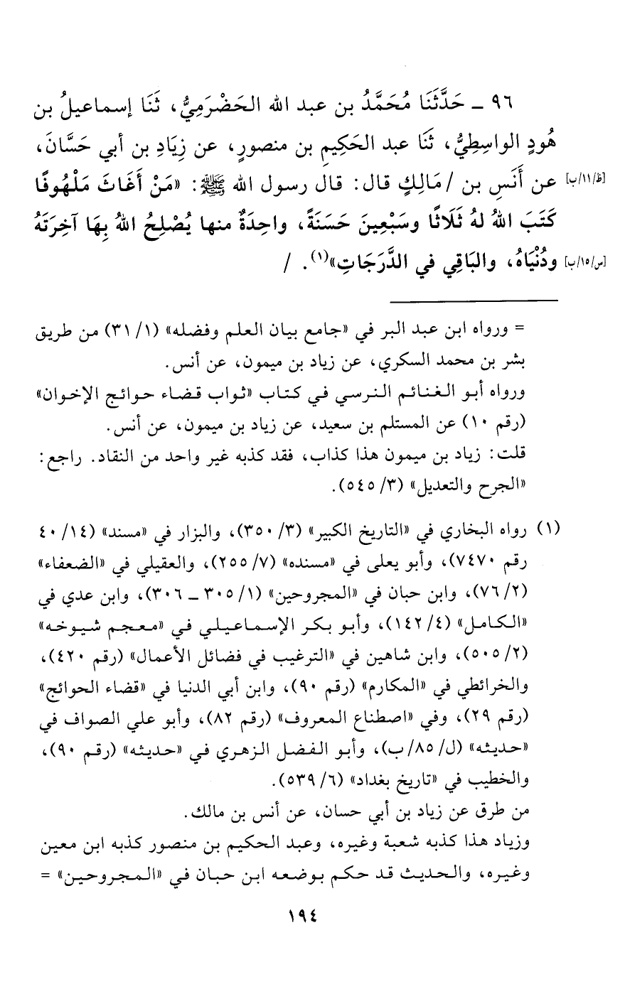 96 - حَدَّثَنَا مُحَمَّدُ بْنُ عَبْدِ اللَّهِ الْحَضْرَمِيُّ، حَدَّثَنَا إِسْمَاعِيلُ بْنُ هُودٍ الْوَاسِطِيُّ، حَدَّثَنَا عَبْدُ الْحَكِيمِ بْنُ مَنْصُورٍ، عَنْ زِيَادِ بْنِ أَبِي حَسَّانَ، عَنْ أَنَسِ بْنِ مَالِكٍ قَالَ: قَالَ رَسُولُ اللَّهِ صَلَّى اللَّهُ عَلَيْهِ وَسَلَّمَ: "مَنْ أَغَاثَ مَلْهُوفًا كَتَبَ اللَّهُ لَهُ ثَلَاثًا وَسَبْعِينَ حَسَنَةً، وَاحِدَةٌ مِنْهَا يُصْلِحُ اللَّهُ بِهَا آخِرَتَهُ وَدُنْيَاهُ، وَالْبَاقِي فِي الدَّرَجَاتِ".