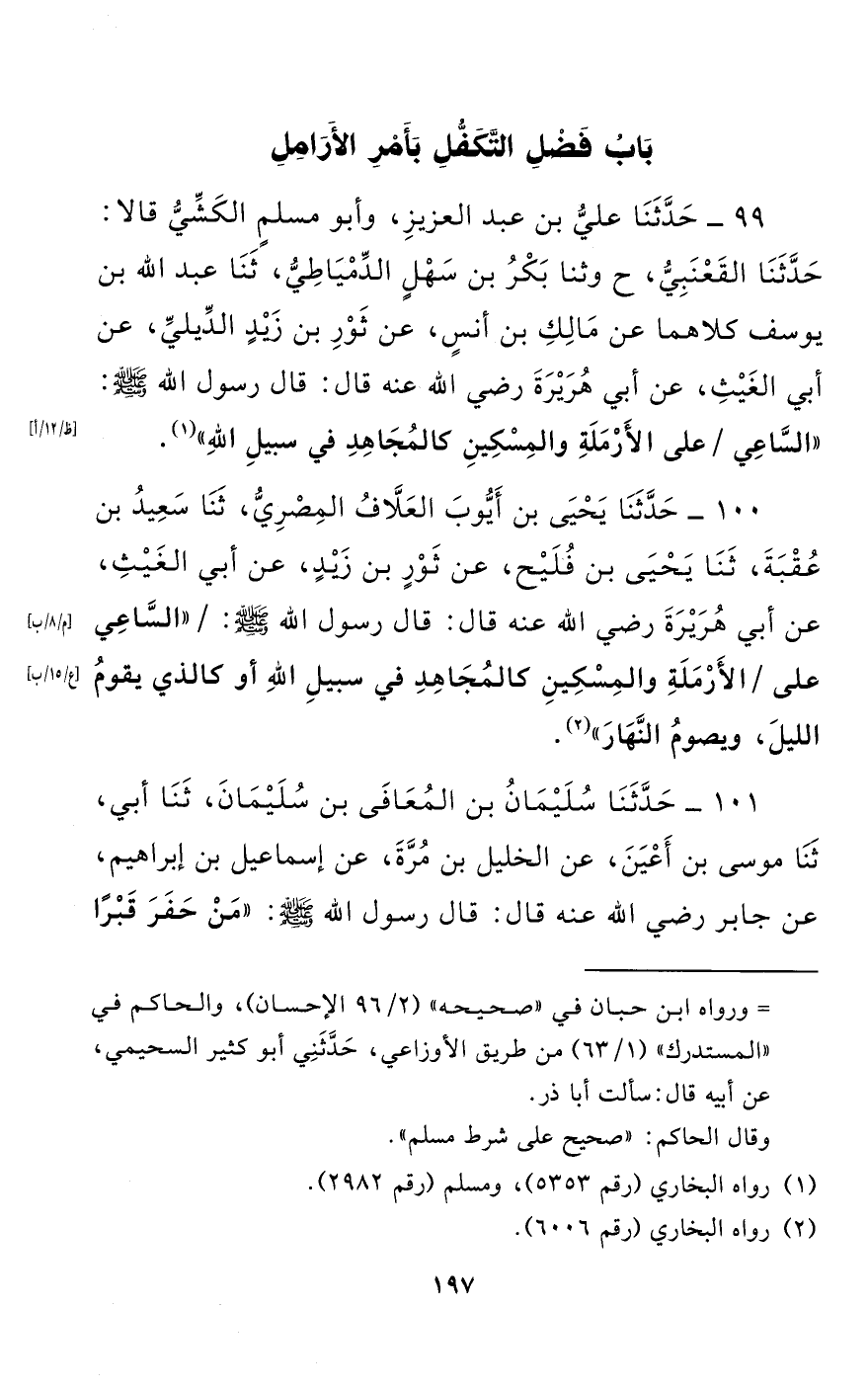 99 - حَدَّثَنَا عَلِيُّ بْنُ عَبْدِ الْعَزِيزِ، وَأَبُو مُسْلِمٍ الْكَشِّيُّ قَالَا: حَدَّثَنَا الْقَعْنَبِيُّ (ح) وَحَدَّثَنَا بَكْرُ بْنُ سَهْلٍ الدِّمْيَاطِيُّ، حَدَّثَنَا عَبْدُ اللَّهِ بْنُ يُوسُفَ كِلَاهُمَا عَنْ مَالِكِ بْنِ أَنَسٍ، عَنْ ثَوْرِ بْنِ زَيْدٍ الدِّيلِيِّ، عَنْ أَبِي الْغَيْثِ، عَنْ أَبِي هُرَيْرَةَ رَضِيَ اللَّهُ عَنْهُ قَالَ: قَالَ رَسُولُ اللَّهِ صَلَّى اللَّهُ عَلَيْهِ وَسَلَّمَ: "السَّاعِي عَلَى الْأَرْمَلَةِ وَالْمِسْكِينِ كَالْمُجَاهِدِ فِي سَبِيلِ اللَّهِ".