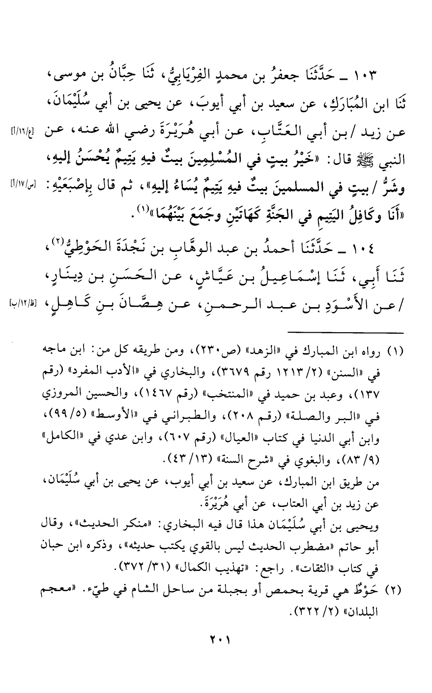 103 - حَدَّثَنَا جَعْفَرُ بْنُ مُحَمَّدٍ الْفِرْيَابِيُّ، حَدَّثَنَا حِبَّانُ بْنُ مُوسَى، حَدَّثَنَا ابْنُ الْمُبَارَكِ، عَنْ سَعِيدِ بْنِ أَبِي أَيُّوبَ، عَنْ يَحْيَى بْنِ أَبِي سُلَيْمَانَ، عَنْ زَيْدِ بْنِ أَبِي الْعَتَّابِ، عَنْ أَبِي هُرَيْرَةَ - رضي الله عنه -، عَنِ النَّبِيِّ صَلَّى اللَّهُ عَلَيْهِ وَسَلَّمَ قَالَ: "خَيْرُ بَيْتٍ فِي الْمُسْلِمِينَ بَيْتٌ فِيهِ يَتِيمٌ يُحْسَنُ إِلَيْهِ، وَشَرُّ بَيْتٍ فِي الْمُسْلِمِينَ بَيْتٌ فِيهِ يَتِيمٌ يُسَاءُ إِلَيْهِ"، ثُمَّ قَالَ بِإِصْبَعَيْهِ: "أَنَا وَكَافِلُ الْيَتِيمِ فِي الْجَنَّةِ كَهَاتَيْنِ وَجَمَعَ بَيْنَهُمَا".