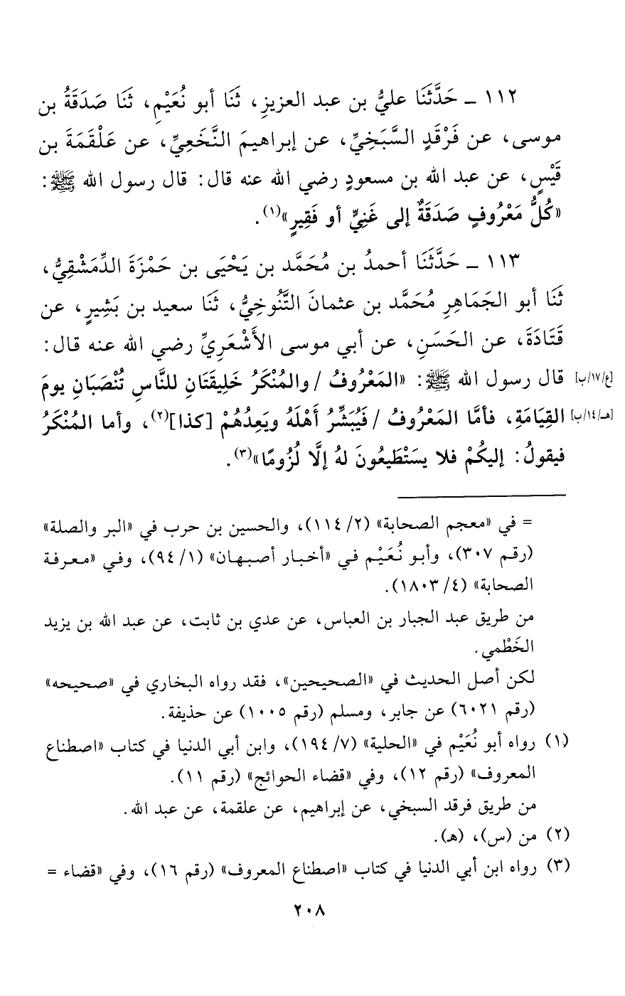 112 - حَدَّثَنَا عَلِيُّ بْنُ عَبْدِ الْعَزِيزِ، حَدَّثَنَا أَبُو نُعَيْمٍ، حَدَّثَنَا صَدَقَةُ بْنُ مُوسَى، عَنْ فَرْقَدٍ السَّبَخِيِّ، عَنْ إِبْرَاهِيمَ النَّخَعِيِّ، عَنْ عَلْقَمَةَ بْنِ قَيْسٍ، عَنْ عَبْدِ اللَّهِ بْنِ مَسْعُودٍ - رضي الله عنه - قَالَ: قَالَ رَسُولُ اللَّهِ صَلَّى اللَّهُ عَلَيْهِ وَسَلَّمَ: "كُلُّ مَعْرُوفٍ صَدَقَةٌ إِلَى غَنِيٍّ أَوْ فَقِيرٍ".