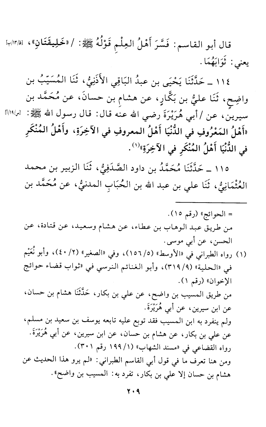 114 - حَدَّثَنَا يَحْيَى بْنُ عَبْدِ الْبَاقِي الْأَذَنِيُّ، حَدَّثَنَا الْمُسَيَّبُ بْنُ وَاضِحٍ، حَدَّثَنَا عَلِيُّ بْنُ بَكَّارٍ، عَنْ هِشَامِ بْنِ حَسَّانَ، عَنْ مُحَمَّدِ بْنِ سِيرِينَ، عَنْ أَبِي هُرَيْرَةَ - رضي الله عنه - قَالَ: قَالَ رَسُولُ اللَّهِ صَلَّى اللَّهُ عَلَيْهِ وَسَلَّمَ: "أَهْلُ الْمَعْرُوفِ فِي الدُّنْيَا أَهْلُ الْمَعْرُوفِ فِي الْآخِرَةِ، وَأَهْلُ الْمُنْكَرِ فِي الدُّنْيَا أَهْلُ الْمُنْكَرِ فِي الْآخِرَةِ".