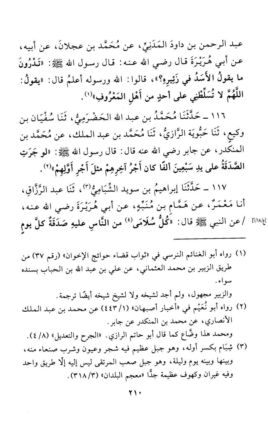 117 - حَدَّثَنَا إِبْرَاهِيمُ بْنُ سُوَيْدٍ الشِّبَامِيُّ، حَدَّثَنَا عَبْدُ الرَّزَّاقِ، أنا مَعْمَرٌ، عَنْ هَمَّامِ بْنِ مُنَبِّهٍ، عَنْ أَبِي هُرَيْرَةَ - رضي الله عنه -، عَنِ النَّبِيِّ صَلَّى اللَّهُ عَلَيْهِ وَسَلَّمَ قَالَ "كُلُّ سُلَامَى مِنَ النَّاسِ عَلَيْهِ صَدَقَةٌ كُلَّ يَوْمٍ تَطْلُعُ فِيهِ الشَّمْسُ، فَإِنْ تَعْدِلْ بَيْنَ اثْنَيْنِ فَهُوَ صَدَقَةٌ، وَإِنْ تُعِنِ الرَّجُلَ عَلَى دَابَّتِهِ صَدَقَةٌ، أَوْ تَرْفَعْ لَهُ عَلَيْهَا مَتَاعَهُ صَدَقَةٌ، وَالْكَلِمَةُ الطَّيِّبَةُ صَدَقَةٌ، وَكُلُّ خُطْوَةٍ تَمْشِيهَا إِلَى الصَّلَاةِ صَدَقَةٌ، وَإِمَاطَتُكَ الْأَذَى عَنِ الطَّرِيقِ صَدَقَةٌ".