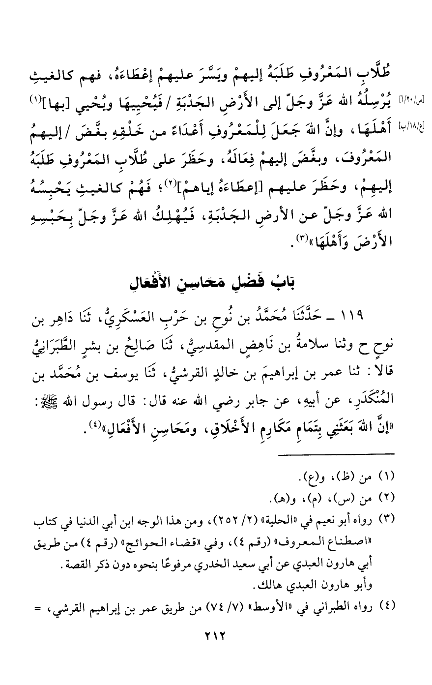 119 - حَدَّثَنَا مُحَمَّدُ بْنُ نُوحِ بْنِ حَرْبٍ الْعَسْكَرِيُّ، حَدَّثَنَا أَزْهَرُ بْنُ نُوحٍ ح وَحَدَّثَنَا سَلَامَةُ بْنُ نَاهِضٍ الْمَقْدِسِيُّ، حَدَّثَنَا صَالِحُ بْنُ بِشْرٍ الطَّبَرَانِيُّ قَالَا: حَدَّثَنَا عُمَرُ بْنُ إِبْرَاهِيمَ بْنِ خَالِدٍ الْقُرَشِيُّ، حَدَّثَنَا يُوسُفُ بْنُ مُحَمَّدِ بْنِ الْمُنْكَدِرِ، عَنْ أَبِيهِ، عَنْ جَابِرٍ - رضي الله عنه - قَالَ: قَالَ رَسُولُ اللَّهِ صَلَّى اللَّهُ عَلَيْهِ وَسَلَّمَ: "إِنَّ اللَّهَ بَعَثَنِي بِتَمَامِ مَكَارِمِ الْأَخْلَاقِ، وَمَحَاسِنِ الْأَفْعَالِ".