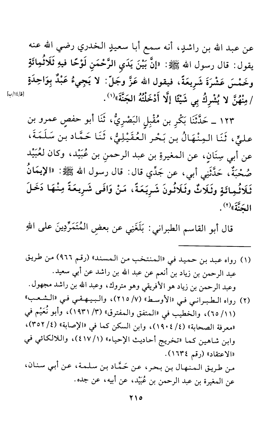 123 - حَدَّثَنَا بَكْرُ بْنُ مُقْبِلٍ الْبَصْرِيُّ، حَدَّثَنَا أَبُو حَفْصٍ عَمْرُو بْنُ عَلِيٍّ، حَدَّثَنَا الْمِنْهَالُ بْنُ بَحْرٍ الْعُقَيْلِيُّ، حَدَّثَنَا حَمَّادُ بْنُ سَلَمَةَ، عَنْ أَبِي سِنَانٍ، عَنِ الْمُغِيرَةِ بْنِ عَبْدِ الرَّحْمَنِ بْنِ عُبَيْدٍ، وَكَانَ لِعُبَيْدٍ صُحْبَةٌ، حَدَّثَنِي أَبِي، عَنْ جَدِّي قَالَ: قَالَ رَسُولُ اللَّهِ صَلَّى اللَّهُ عَلَيْهِ وَسَلَّمَ: "الْإِيمَانُ ثَلَاثُمِائَةٍ وَثَلَاثٌ وَثَلَاثُونَ شَرِيعَةً، مَنْ وَافَى شَرِيعَةً مِنْهَا دَخَلَ الْجَنَّةَ".