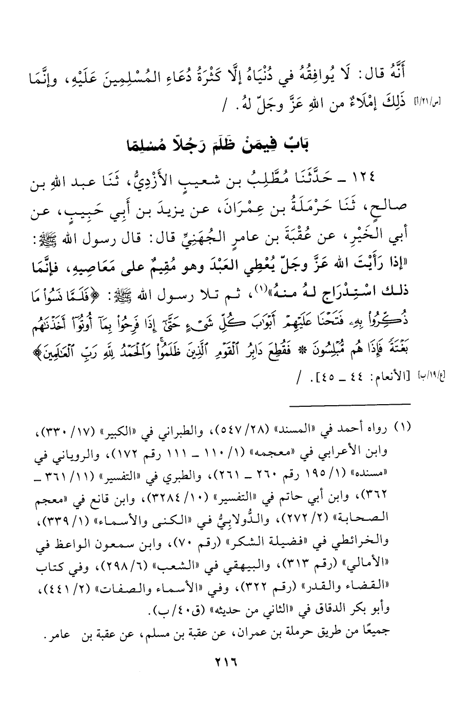 124 - حَدَّثَنَا مُطَّلِبُ بْنُ شُعَيْبٍ الْأَزْدِيُّ، حَدَّثَنَا عَبْدُ اللَّهِ بْنُ صَالِحٍ، حَدَّثَنَا حَرْمَلَةُ بْنُ عِمْرَانَ، عَنْ يَزِيدَ بْنِ أَبِي حَبِيبٍ، عَنْ أَبِي الْخَيْرِ، عَنْ عُقْبَةَ بْنِ عَامِرٍ الْجُهَنِيِّ قَالَ: قَالَ رَسُولُ اللَّهِ صَلَّى اللَّهُ عَلَيْهِ وَسَلَّمَ: "إِذَا رَأَيْتَ اللَّهَ عَزَّ وَجَلَّ يُعْطِي الْعَبْدَ وَهُوَ مقيم عَلَى مَعَاصِيهِ، فَإِنَّمَا ذَلِكَ اسْتِدْرَاجٌ لَهُ منه"، ثُمَّ تَلَا رَسُولُ اللَّهِ صَلَّى اللَّهُ عَلَيْهِ وَسَلَّمَ {فَلَمَّا نَسُوا مَا ذُكِّرُوا بِهِ فتحنا عليهم أبواب كل شيء حتى إذا فرحوا بما أوتوا أخذنهم بغتة فإذا هم مبلسون * فقطع دابر القوم الذين ظلموا والحمد لله ربب العالمين} [الأنعام: 44 - 45].