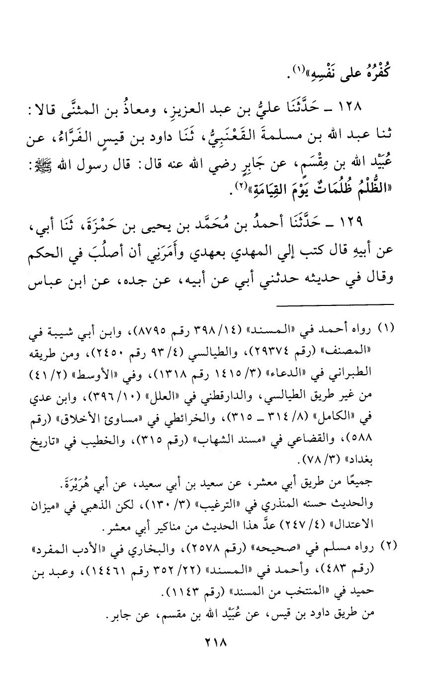 128 - حَدَّثَنَا عَلِيُّ بْنُ عَبْدِ الْعَزِيزِ، وَمُعَاذُ بْنُ الْمُثَنَّى قَالَا: حَدَّثَنَا عَبْدُ اللَّهِ بْنُ مَسْلَمَةَ الْقَعْنَبِيُّ، حَدَّثَنَا دَاوُدُ بْنُ قَيْسٍ الْفَرَّاءُ، عَنْ عُبَيْدِ الله بْنِ مِقْسَمٍ، عَنْ جَابِرٍ - رضي الله عنه - قَالَ: قَالَ رَسُولُ اللَّهِ صَلَّى اللَّهُ عَلَيْهِ وَسَلَّمَ: "الظُّلْمُ ظُلُمَاتٌ يَوْمَ الْقِيَامَةِ".