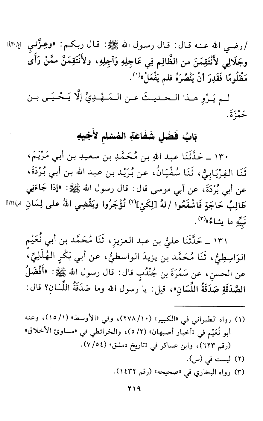 131 - حَدَّثَنَا عَلِيُّ بْنُ عَبْدِ الْعَزِيزِ، حَدَّثَنَا مُحَمَّدُ بْنُ أَبِي نُعَيْمٍ الْوَاسِطِيُّ، حَدَّثَنَا مُحَمَّدُ بْنُ يَزِيدَ الْوَاسِطِيُّ، عَنْ أَبِي بَكْرٍ الْهُذَلِيِّ، عَنِ الْحَسَنِ، عَنْ سَمُرَةَ بْنِ جُنْدُبٍ قَالَ: قَالَ رَسُولُ اللَّهِ صَلَّى اللَّهُ عَلَيْهِ وَسَلَّمَ:" أَفْضَلُ الصَّدَقَةِ صَدَقَةُ اللِّسَانِ"، قِيلَ: يَا رَسُولَ اللَّهِ وَمَا صَدَقَةُ اللِّسَانِ؟ قَالَ: "الشَّفَاعَةُ تَفُكُّ بِهَا الْأَسِيرَ، وَتَحْقِنُ بِهَا الدَّمَ، وَتَجُرُّ بِهَا الْمَعْرُوفَ إِلَى أَخِيكَ، وَتَدْفَعُ عَنْهُ الْكَرِيهَةَ".