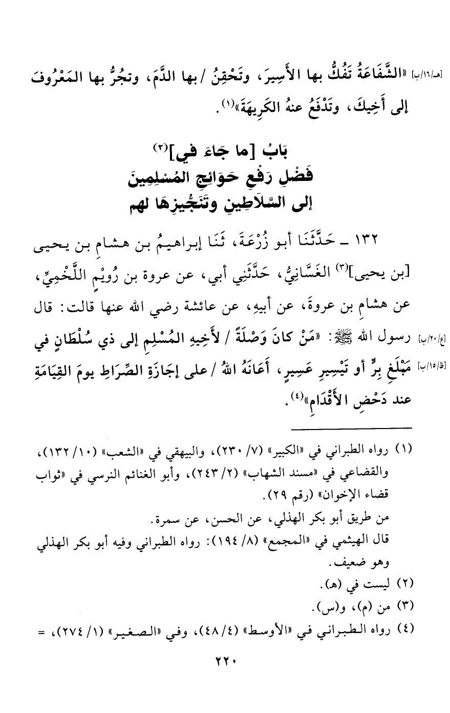 132 - حَدَّثَنَا أَبُو زُرْعَةَ، حَدَّثَنَا إِبْرَاهِيمُ بْنُ هِشَامِ بْنِ يَحْيَى [بن يحيى] الْغَسَّانِيُّ، حدثني أَبِي، عَنْ عُرْوَةَ بْنِ رُوَيْمٍ اللَّخْمِيِّ، عَنْ هِشَامِ بْنِ عُرْوَةَ، عَنْ أَبِيهِ، عَنْ عَائِشَةَ - رضي الله عنها - قَالَتْ: قَالَ رَسُولُ اللَّهِ صَلَّى اللَّهُ عَلَيْهِ وَسَلَّمَ: "مَنْ كَانَ وُصْلَةً لِأَخِيهِ الْمُسْلِمِ إِلَى ذِي سُلْطَانٍ فِي مَبْلَغِ بِرٍّ أَوْ تَيْسِيرِ عَسِيرٍ، أَعَانَهُ اللَّهُ عَلَى إِجَازَةِ الصِّرَاطِ يَوْمَ الْقِيَامَةِ عِنْدَ دَحْضِ الْأَقْدَامِ".