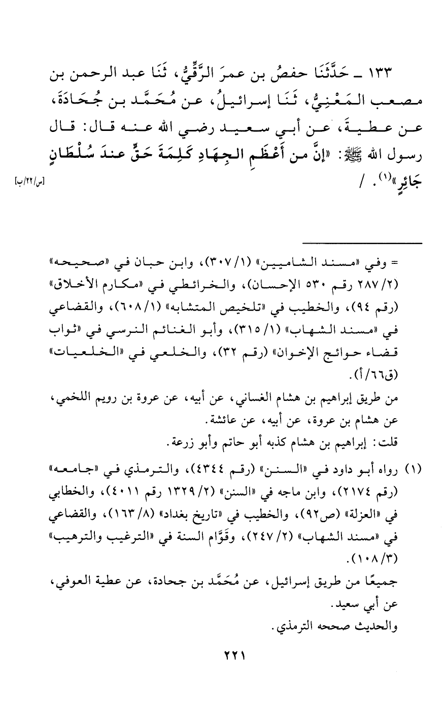133 - حَدَّثَنَا حَفْصُ بْنُ عُمَرَ الرَّقِّيُّ، حَدَّثَنَا عَبْدُ الرَّحْمَنِ بْنُ مُصْعَبٍ الْمَعْنِيُّ، حَدَّثَنَا إِسْرَائِيلُ، عَنْ مُحَمَّدِ بْنِ حُجَادَةَ، عَنْ عَطِيَّةَ، عَنْ أَبِي سَعِيدٍ - رضي الله عنه - قَالَ: قَالَ رَسُولُ اللَّهِ صَلَّى اللَّهُ عَلَيْهِ وَسَلَّمَ: "إِنَّ مِنْ أَعْظَمِ الْجِهَادِ كَلِمَةَ حَقٍّ عِنْدَ سُلْطَانٍ جَائِرٍ".