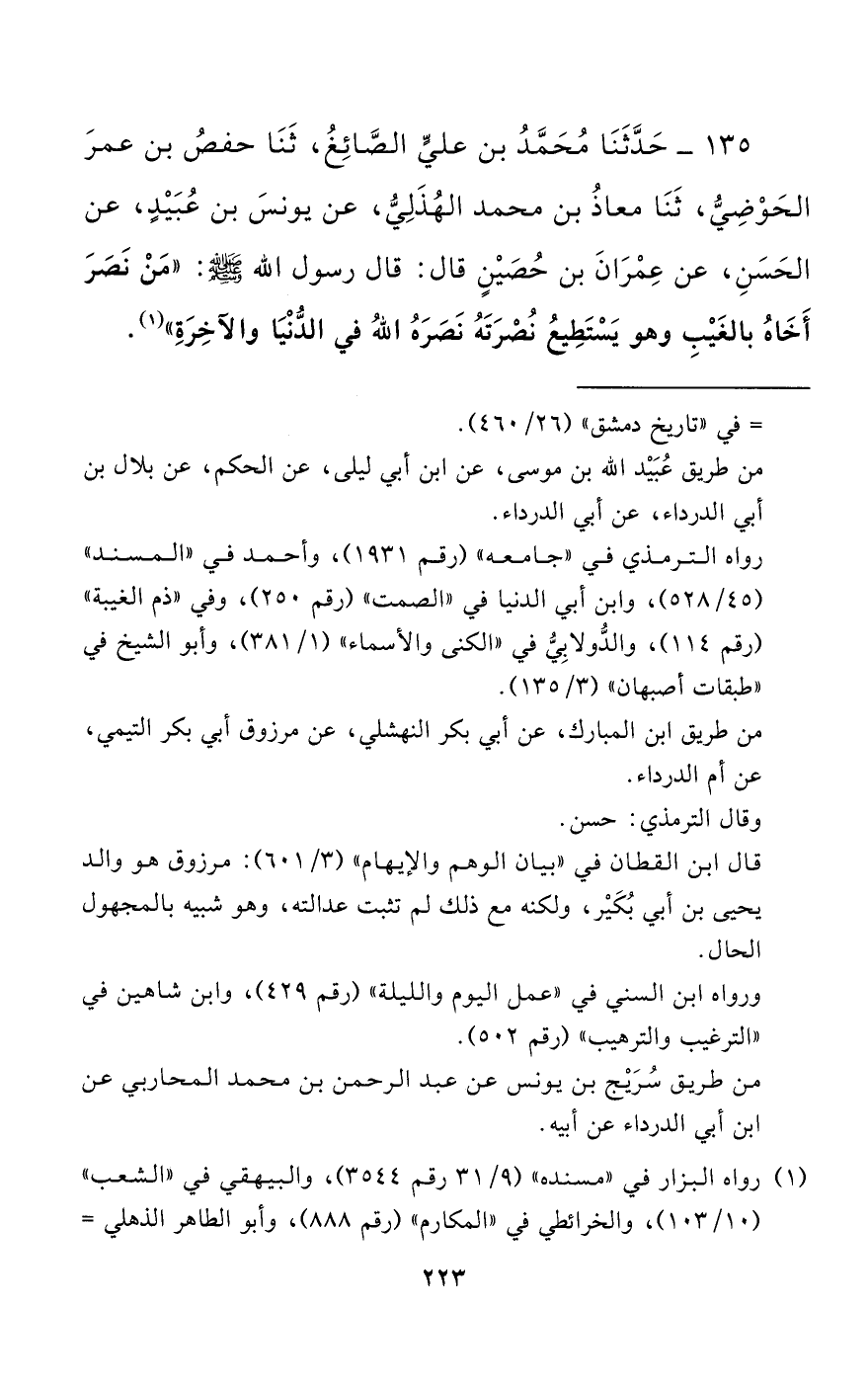 135 - حَدَّثَنَا مُحَمَّدُ بْنُ عَلِيٍّ الصَّائِغُ، حَدَّثَنَا حَفْصُ بْنُ عُمَرَ الْحَوْضِيُّ، حَدَّثَنَا مُعَاذُ بْنُ مُحَمَّدٍ الْهُذَلِيُّ، عَنْ يُونُسَ بْنِ عُبَيْدٍ، عَنِ الْحَسَنِ عَنْ عِمْرَانَ بْنِ حُصَيْنٍ قَالَ: قَالَ رَسُولُ اللَّهِ صَلَّى اللَّهُ عَلَيْهِ وَسَلَّمَ: "مَنْ نَصَرَ أَخَاهُ بِالْغَيْبِ وَهُوَ يَسْتَطِيعُ نُصْرَتَهُ نَصَرَهُ اللَّهُ فِي الدُّنْيَا وَالْآخِرَةِ".