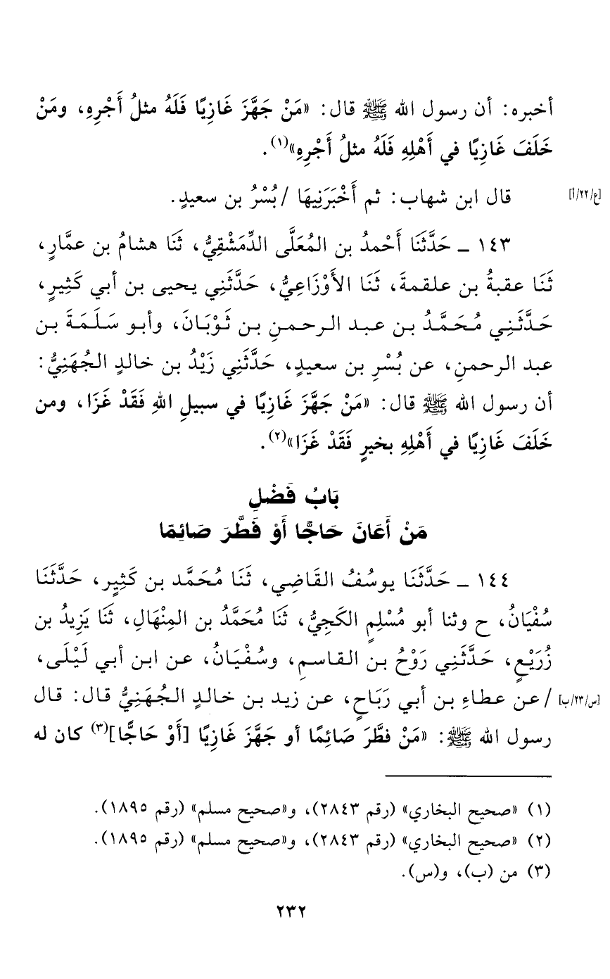 144 - حَدَّثَنَا يُوسُفُ الْقَاضِي، حَدَّثَنَا مُحَمَّدُ بْنُ كَثِيرٍ، حَدَّثَنَا سُفْيَانُ (ح) وَثَنًا أَبُو مُسْلِمٍ الْكَجي، حَدَّثَنَا مُحَمَّدُ بْنُ الْمِنْهَالِ، حَدَّثَنَا يَزِيدُ بْنُ زُرَيْعٍ، حدثني رَوْحُ بْنُ الْقَاسِمِ، وَسُفْيَانُ، عَنِ ابْنِ أَبِي لَيْلَى، عَنْ عَطَاءِ بْنِ أَبِي رَبَاحٍ، عَنْ زَيْدِ بْنِ خَالِدٍ الْجُهَنِيِّ قَالَ: قَالَ رَسُولُ اللَّهِ صَلَّى اللَّهُ عَلَيْهِ وَسَلَّمَ: "مَنْ فَطَّرَ صَائِمًا أَوْ جَهَّزَ غَازِيًا [أو حاجا] كَانَ لَهُ مِثْلُ أَجْرِهِم مِنْ غَيْرِ أَنْ يُنْتَقَصَ مِنْ أُجُورِهِمْ شَيْءٌ".