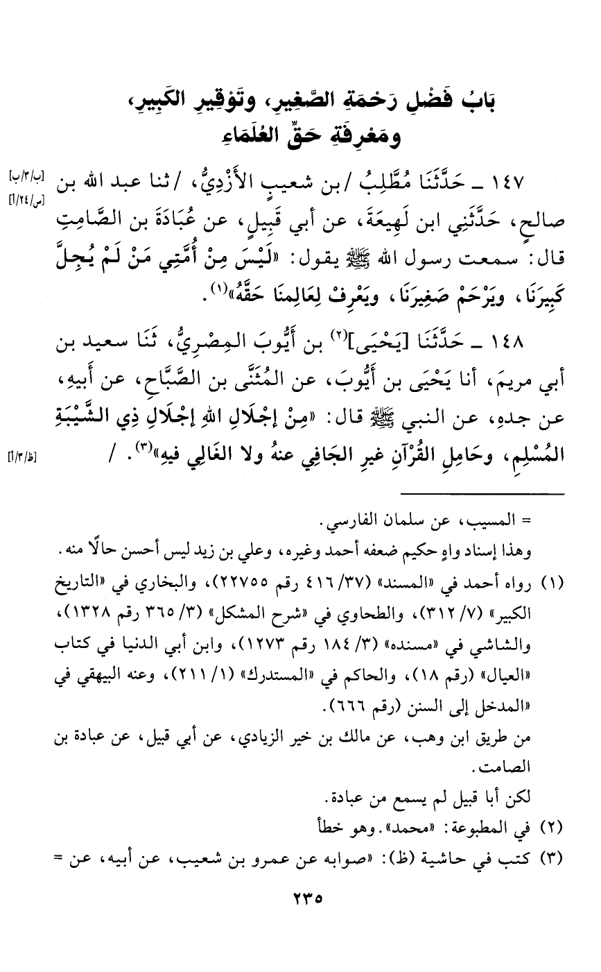 147 - حَدَّثَنَا مُطَّلِبُ بْنُ شُعَيْبٍ الْأَزْدِيُّ، حَدَّثَنَا عَبْدُ اللَّهِ بْنُ صَالِحٍ، حدثني ابْنُ لَهِيعَةَ، عَنْ أَبِي قَبِيلٍ، عَنْ عُبَادَةَ بْنِ الصَّامِتِ قَالَ: سَمِعْتُ رَسُولَ اللَّهِ صَلَّى اللَّهُ عَلَيْهِ وَسَلَّمَ يَقُولُ: "لَيْسَ مِنْ أُمَّتِي مَنْ لَمْ يُجِلَّ كَبِيرَنَا، وَيَرْحَمْ صَغِيرَنَا، وَيَعْرِفْ لِعَالِمِنَا حَقَّهُ".