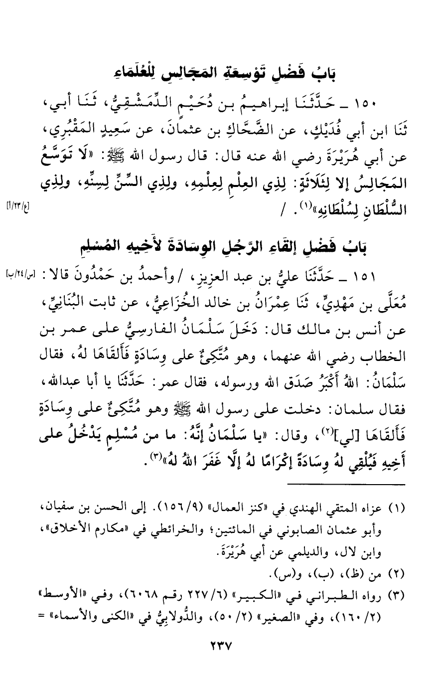 151 - حَدَّثَنَا عَلِيُّ بْنُ عَبْدِ الْعَزِيزِ، وَأَحْمَدُ بْنُ حَمْدُونَ قَالَا: مُعَلَّى بْنُ مَهْدِيٍّ، حَدَّثَنَا عِمْرَانُ بْنُ خَالِدٍ الْخُزَاعِيُّ، عَنْ ثَابِتٍ الْبُنَانِيِّ، عَنْ أَنَسِ بْنِ مَالِكٍ قَالَ: دَخَلَ سَلْمَانُ الْفَارِسِيُّ عَلَى عُمَرَ بْنِ الْخَطَّابِ رَضِيَ اللَّهُ عَنْهُمَا، وَهُوَ مُتَّكِئٌ عَلَى وِسَادَةٍ فَأَلْقَاهَا لَهُ، فَقَالَ سَلْمَانُ: اللَّهُ أَكْبَرُ صَدَقَ اللَّهِ ورَسُوله. فَقَالَ عُمَرُ: حَدِّثْنَا يَا أَبَا عَبْدِ اللَّهِ، فَقَالَ سَلْمَانُ: دَخَلْتُ عَلَى رَسُولِ اللَّهِ صَلَّى اللَّهُ عَلَيْهِ وَسَلَّمَ وَهُوَ مُتَّكِئٌ عَلَى وِسَادَةٍ فَأَلْقَاهَا [لي]، وَقَالَ: "يَا سَلْمَانُ إِنَّهُ: مَا مِنْ مُسْلِمٍ يَدْخُلُ عَلَى أَخِيهِ فَيُلْقِي لَهُ وِسَادَةً إِكْرَامًا لَهُ إِلَّا غَفَرَ اللَّهُ لَهُ".