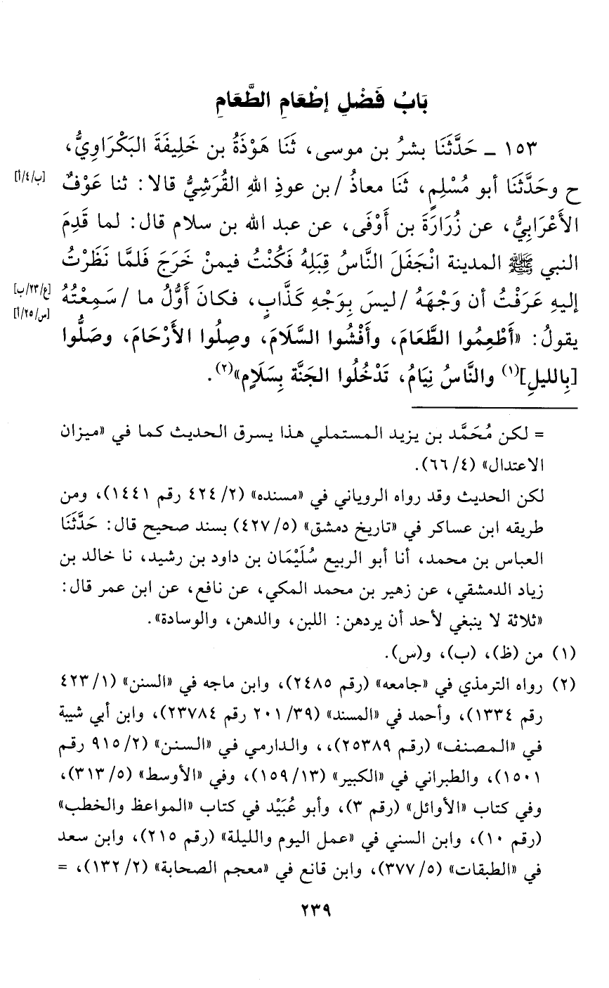 153 - حَدَّثَنَا بِشْرُ بْنُ مُوسَى، حَدَّثَنَا هَوْذَةُ بْنُ خَلِيفَةَ الْبَكْرَاوِيُّ (ح) وَحَدَّثَنَا أَبُو مُسْلِمٍ، حَدَّثَنَا مُعَاذُ بْنُ عَوْذِ اللَّهِ الْقُرَشِيُّ قَالَا: حَدَّثَنَا عَوْفٌ الْأَعْرَابِيُّ، عَنْ زُرَارَةَ بْنِ أَبِي أَوْفَى، عَنْ عَبْدِ اللَّهِ بْنِ سَلَّامٍ قَالَ: لَمَّا قَدِمَ النَّبِيُّ صَلَّى اللَّهُ عَلَيْهِ وَسَلَّمَ الْمَدِينَةَ انْجَفَلَ النَّاسُ قِبَلَهُ فَكُنْتُ فِيمَنْ خَرَجَ فَلَمَّا نَظَرْتُ إِلَيْهِ عَرَفْتُ أَنَّ وَجْهَهُ لَيْسَ بِوَجْهِ كَذَّابٍ، فَكَانَ أَوَّلُ مَا سَمِعْتُهُ يَقُولُ: "أَطْعِمُوا الطَّعَامَ، وَأَفْشُوا السَّلَامَ، وَصِلُوا الْأَرْحَامَ، وَصَلُّوا [بالليل] وَالنَّاسُ نِيَامٌ، تَدْخُلُوا الْجَنَّةَ بِسَلَامٍ".