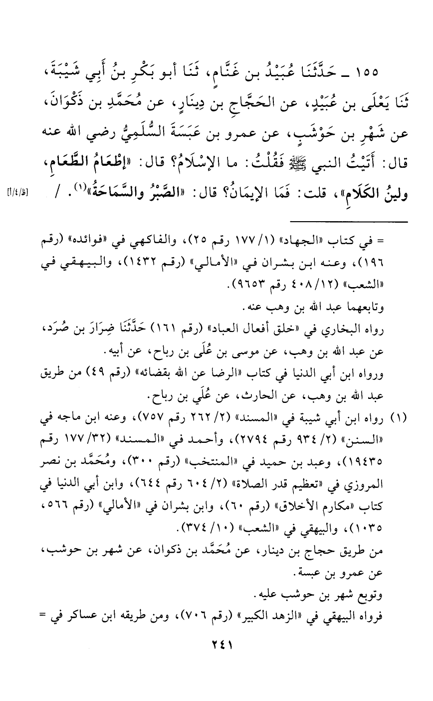 155 - حَدَّثَنَا عُبَيْدُ بْنُ غَنَّامٍ، حَدَّثَنَا أَبُو بَكْرِ بْنُ أَبِي شَيْبَةَ، حَدَّثَنَا يَعْلَى بْنُ عُبَيْدٍ، عَنِ الْحَجَّاجِ بْنِ دِينَارٍ، عَنْ مُحَمَّدِ بْنِ ذَكْوَانَ، عَنْ شَهْرِ بْنِ حَوْشَبٍ، عَنْ عَمْرِو بْنِ عَبَسَةَ السُّلَمِيِّ - رضي الله عنه - قَالَ: أَتَيْتُ النَّبِيَّ صَلَّى اللَّهُ عَلَيْهِ وَسَلَّمَ فَقُلْتُ: مَا الْإِسْلَامُ؟ قَالَ: "إِطْعَامُ الطَّعَامِ، وَلِينُ الْكَلَامِ"، قُلْتُ: فَمَا الْإِيمَانُ؟ قَالَ: "الصَّبْرُ وَالسَّمَاحَةُ".
