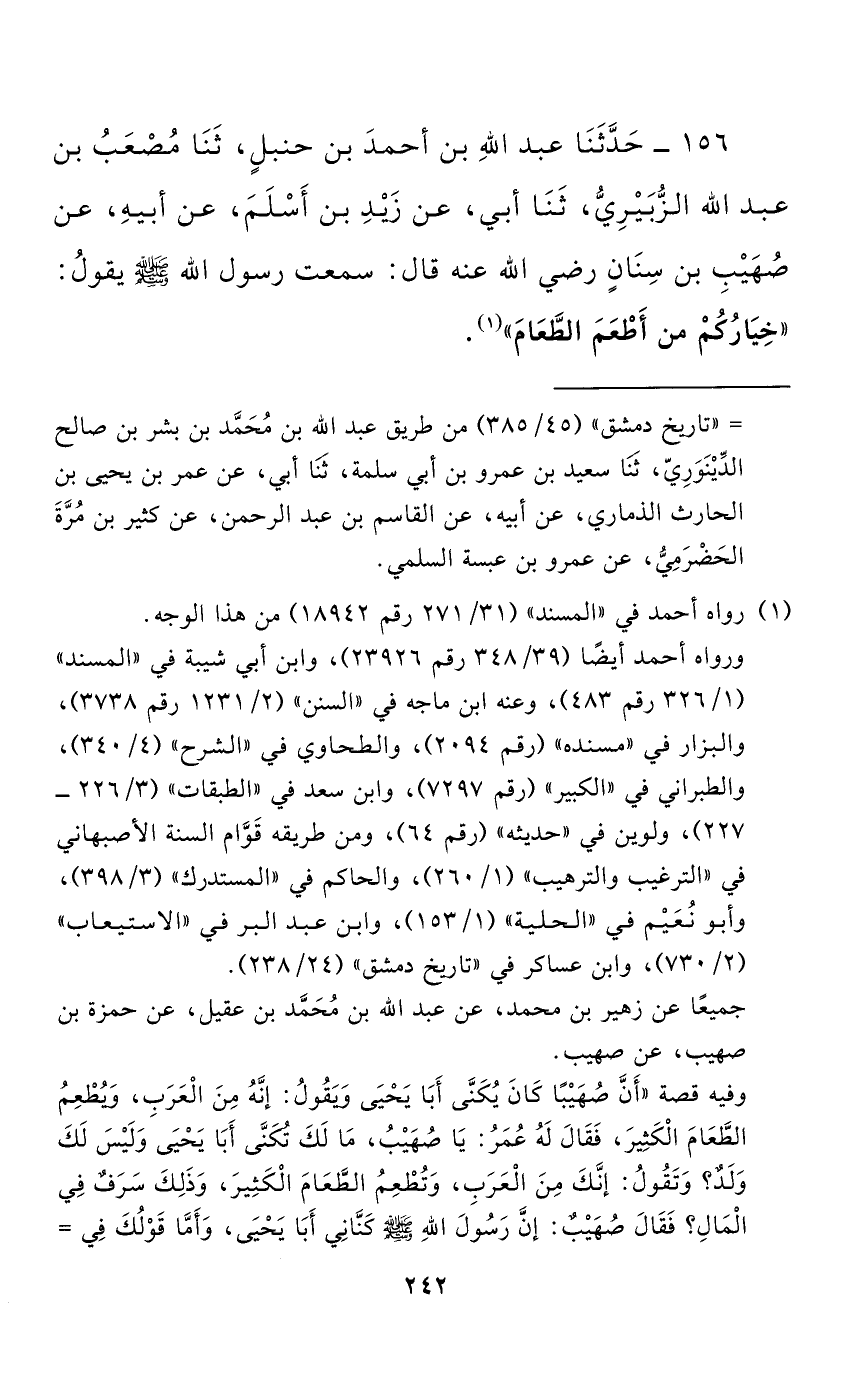 156 - حَدَّثَنَا عَبْدُ اللَّهِ بْنُ أَحْمَدَ بْنِ حَنْبَلٍ، حَدَّثَنَا مُصْعَبُ بْنُ عَبْدِ اللَّهِ الزُّبَيْرِيُّ، حَدَّثَنَا أَبِي، عَنْ زَيْدِ بْنِ أَسْلَمَ، عَنْ أَبِيهِ، عَنْ صُهَيْبِ بْنِ سِنَانٍ - رضي الله عنه - قَالَ: سَمِعْتُ رَسُولَ اللَّهِ صَلَّى اللَّهُ عَلَيْهِ وَسَلَّمَ يَقُولُ: "خِيَارُكُمْ مَنْ أَطْعَمَ الطَّعَامَ".