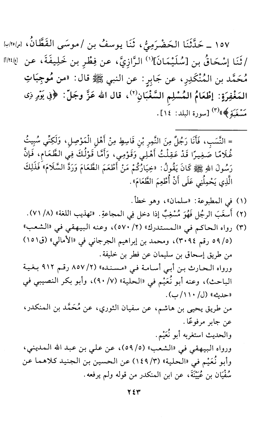 157 - حَدَّثَنَا الْحَضْرَمِيُّ، حَدَّثَنَا يُوسُفُ بْنُ مُوسَى الْقَطَّانُ، حَدَّثَنَا إِسْحَاقُ بْنُ سَلْيمانَ الرَّازِيُّ، عَنْ فِطْرِ بْنِ خَلِيفَةَ، عَنْ مُحَمَّدِ بْنِ الْمُنْكَدِرِ، عَنْ جَابِرٍ: عَنِ النَّبِيِّ صَلَّى اللَّهُ عَلَيْهِ وَسَلَّمَ قَالَ: "مِنْ مُوجِبَاتِ الْمَغْفِرَةِ: إِطْعَامُ الْمُسْلِمِ السَّغْبَانِ قَالَ اللَّهُ عَزَّ وَجَلَّ {فِي يَوْمٍ ذِي مَسْغَبَةٍ} " [البلد: 14].