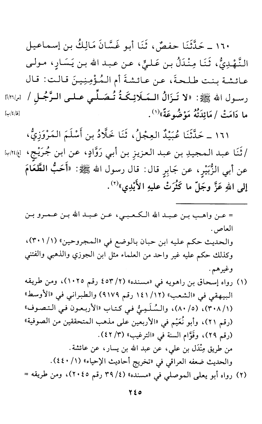 160 - حَدَّثَنَا حَفْصٌ، حَدَّثَنَا أَبُو غَسَّانَ مَالِكُ بْنُ إسماعيل النَّهْدِيُّ، حَدَّثَنَا مِنْدَلُ بْنُ عَلِيٍّ، عَنْ عَبْدِ اللَّهِ بْنِ يَسَارٍ، مَوْلَى عَائِشَةَ بِنْتِ طَلْحَةَ، عَنْ عَائِشَةَ أُمِّ الْمُؤْمِنِينَ قَالَتْ: قَالَ رَسُولُ اللَّهِ صَلَّى اللَّهُ عَلَيْهِ وَسَلَّمَ: "لَا تَزَالُ الْمَلَائِكَةُ تُصَلِّي عَلَى الرَّجُلِ مَا دَامَتْ مَائِدَتُهُ مَوْضُوعَةً".
