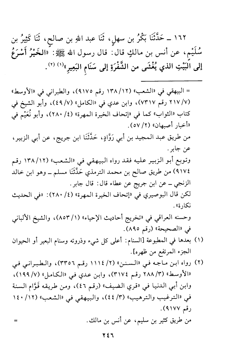 162 - حَدَّثَنَا بَكْرُ بْنُ سَهْلٍ، حَدَّثَنَا عَبْدُ اللَّهِ بْنُ صَالِحٍ، حَدَّثَنَا كَثِيرُ بْنُ سُلَيْمٍ، عَنْ أَنَسِ بْنِ مَالِكٍ قَالَ: قَالَ رَسُولُ اللَّهِ صَلَّى اللَّهُ عَلَيْهِ وَسَلَّمَ: "الْخَيْرُ أَسْرَعُ إِلَى الْبَيْتِ الَّذِي يُغْشَى مِنَ الشَّفْرَةِ إِلَى سَنَامِ الْبَعِيرِ".