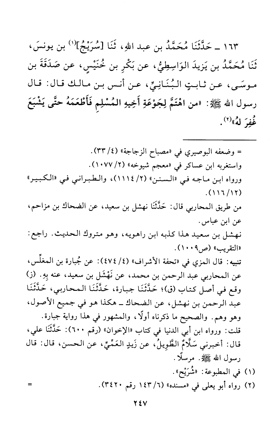 163 - حَدَّثَنَا مُحَمَّدُ بْنُ عَبْدِ اللَّهِ، حَدَّثَنَا سُريج بْنُ يُونُسَ، حَدَّثَنَا مُحَمَّدُ بْنُ يَزِيدَ الْوَاسِطِيُّ، عَنْ بَكْرِ بْنِ خُنَيْسٍ، عَنْ صَدَقَةَ بْنَ مُوسَى، عَنْ ثَابِتٍ الْبُنَانِيِّ، عَنْ أَنَسِ بْنِ مَالِكٍ قَالَ: قَالَ رَسُولُ اللَّهِ صَلَّى اللَّهُ عَلَيْهِ وَسَلَّمَ: "مَنِ اهْتَمَّ لِجَوْعَةِ أَخِيهِ الْمُسْلِمِ فَأَطْعَمَهُ حَتَّى يَشْبَعَ غُفِرَ لَهُ".