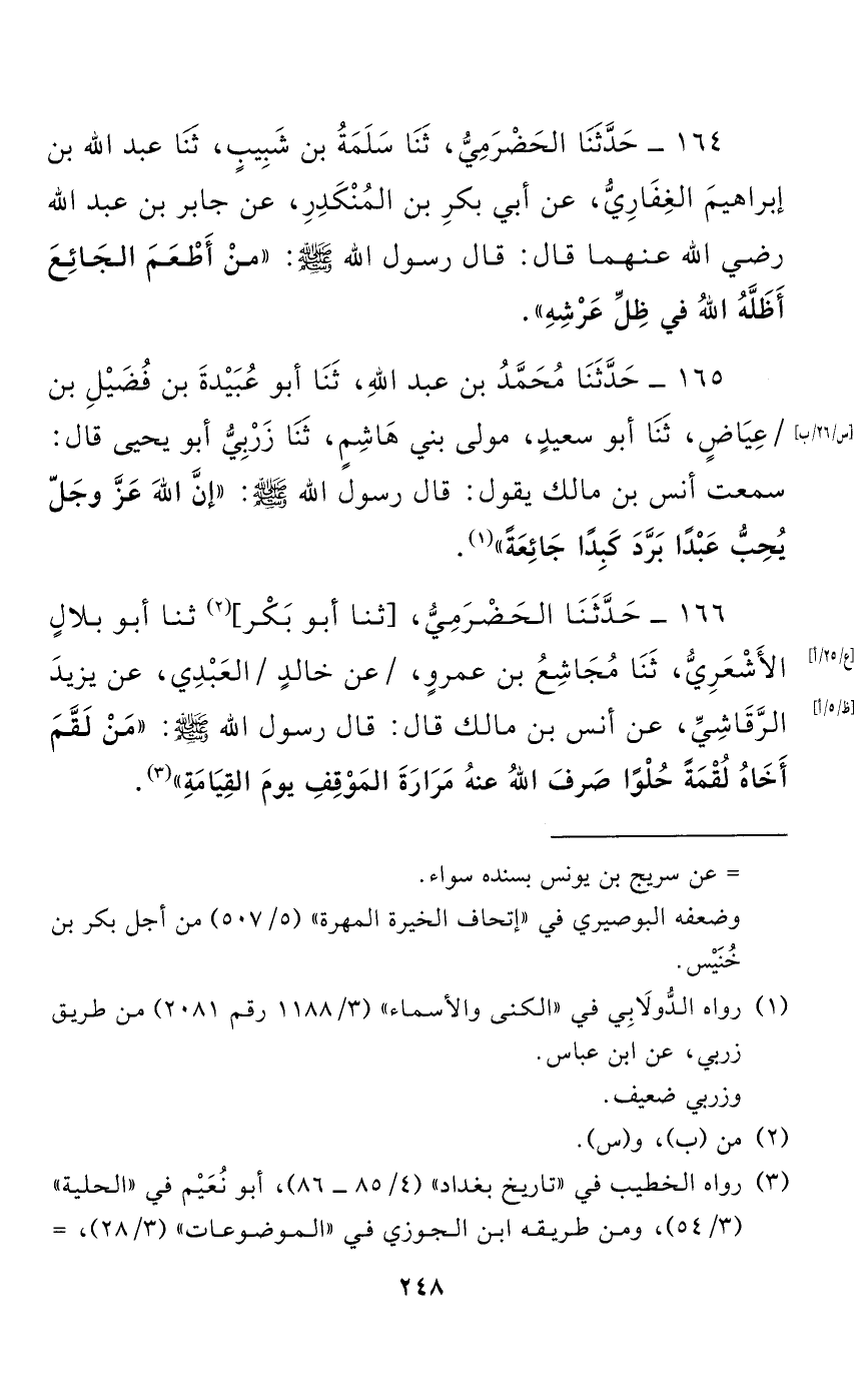 165 - حَدَّثَنَا مُحَمَّدُ بْنُ عَبْدِ اللَّهِ، حَدَّثَنَا أَبُو عُبَيْدَةَ بْنُ فُضَيْلِ بْنِ عِيَاضٍ، حَدَّثَنَا أَبُو سَعِيدٍ، مَوْلَى بَنِي هَاشِمٍ، حَدَّثَنَا زَرْبِيُّ أَبُو يَحْيَى قَالَ: سَمِعْتُ أَنَسَ بْنَ مَالِكٍ يَقُولُ: قَالَ رَسُولُ اللَّهِ صَلَّى اللَّهُ عَلَيْهِ وَسَلَّمَ: "إِنَّ اللَّهَ عَزَّ وَجَلَّ يُحِبُّ عَبْدًا بَرَّدَ كَبِدًا جَائِعَةً".
