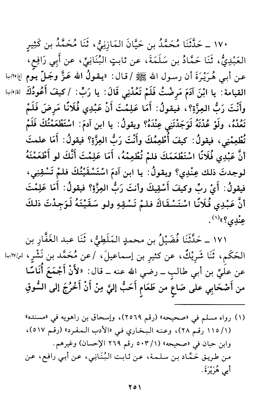 170 - حَدَّثَنَا مُحَمَّدُ بْنُ حَيَّانَ الْمَازِنِيُّ، حَدَّثَنَا مُحَمَّدُ بْنُ كَثِيرٍ الْعَبْدِيُّ، حَدَّثَنَا حَمَّادُ بْنُ سَلَمَةَ، عَنْ ثَابِتٍ الْبُنَانِيِّ، عَنْ أَبِي رَافِعٍ، عَنْ أَبِي هُرَيْرَةَ أَنَّ رَسُولَ اللَّهِ صَلَّى اللَّهُ عَلَيْهِ وَسَلَّمَ قَالَ: "يَقُولُ اللَّهُ عَزَّ وَجَلَّ يَوْمَ الْقِيَامَةِ: يَا ابْنَ آدَمَ مَرِضْتُ فَلَمْ تَعُدْنِي قَالَ: يَا رَبِّ: كَيْفَ أَعُودُكَ وَأَنْتَ رَبُّ الْعِزَّةِ؟، فَيَقُولُ: أَمَا عَلِمْتَ أَنَّ عَبْدِي فُلَانًا مَرِضَ فَلَمْ تَعُدْهُ، وَلَوْ عُدْتَهُ لَوَجَدْتَنِي عِنْدَهُ؟ وَيَقُولُ: يَا ابْنَ آدَمَ: اسْتَطْعَمْتُكَ فَلَمْ تُطْعِمْنِي، فَيَقُولُ: كَيْفَ أُطْعِمُكَ وَأَنْتَ رَبُّ الْعِزَّةِ؟ فَيَقُولُ: أَمَا عَلِمْتَ أَنَّ عَبْدِي فُلَانًا اسْتَطْعَمَكَ فَلَمْ تُطْعِمْهُ، أَمَا عَلِمْتَ أَنَّكَ لَوَ أَطْعَمْتَهُ لَوَجِدْتَ ذَلِكَ عِنْدِي؟ وَيَقُولُ: يَا ابْنَ آدَمَ اسْتَسْقَيْتُكَ فَلَمْ تَسْقِنِي، فَيَقُولُ: أَيْ رَبِّ وَكَيْفَ أَسْقِيكَ وَأَنْتَ رَبُّ الْعِزَّةِ؟ فَيَقُولُ: أَمَا عَلِمْتَ أَنَّ عَبْدِي فُلَانًا اسْتَسْقَاكَ فَلَمْ تَسْقِهِ وَلَوْ سَقَيْتَهُ لَوَجِدْتَ ذَلِكَ عِنْدِي؟ ".