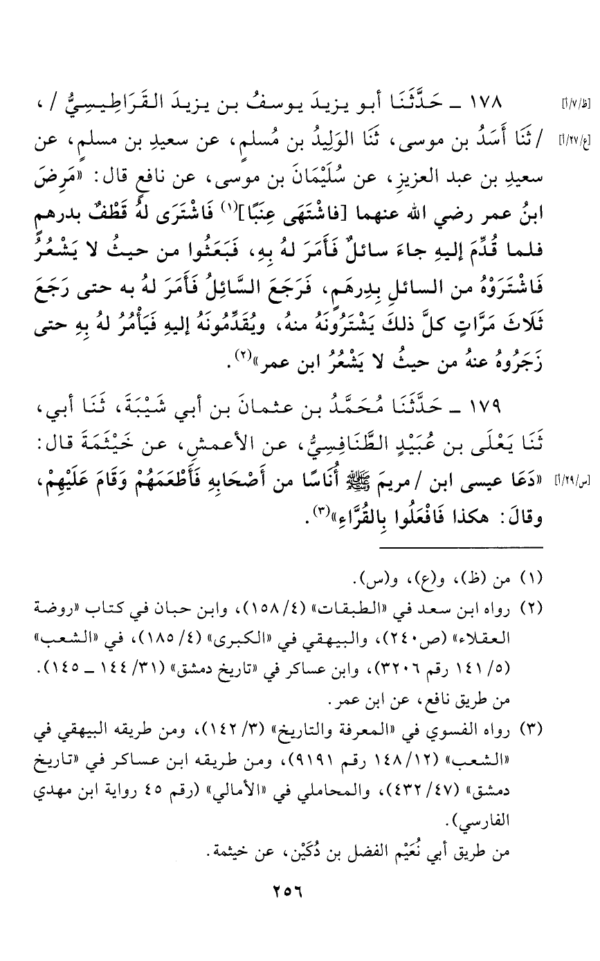 178 - حَدَّثَنَا أَبُو يزَيْدٍ يُوسُفُ بْنُ يَزِيدَ الْقَرَاطِيسِيُّ، حَدَّثَنَا أَسَدُ بْنُ مُوسَى، حَدَّثَنَا الْوَلِيدُ بْنُ مُسْلِمٍ، عَنْ سَعِيدِ بْنِ مُسْلِمٍ، عَنْ سَعِيدِ بْنِ عَبْدِ الْعَزِيزِ، عَنْ سُلَيْمَانَ بْنِ مُوسَى، عَنْ نَافِعٍ قَالَ: "مَرِضَ ابْنُ عُمَرَ رَضِيَ اللَّهُ عَنْهُما [فاشتهى عِنَبًا] فاشترى لَهُ قَطْفٌ بِدِرْهَمٍ فَلَمَّا قُدِّمَ إِلَيْهِ جَاءَ سَائِلٌ فَأَمَرَ لَهُ بِهِ، فَبَعَثُوا مِنْ حَيْثُ لَا يَشْعُرُ فَاشْتَرَوْهُ مِنَ السَّائِلِ بِدِرْهَمٍ، فَرَجَعَ السَّائِلُ فَأَمَرَ لَهُ بِهِ حَتَّى رَجَعَ ثَلَاثَ مرات كُلَّ ذَلِكَ يَشْتَرُونَهُ مِنْهُ، وَيُقَدِّمُونَهُ إِلَيْهِ فَيَأْمُرُ لَهُ بِهِ حَتَّى زَجَرُوهُ عَنْهُ مِنْ حَيْثُ لَا يَشْعُرُ ابْنُ عُمَرَ".