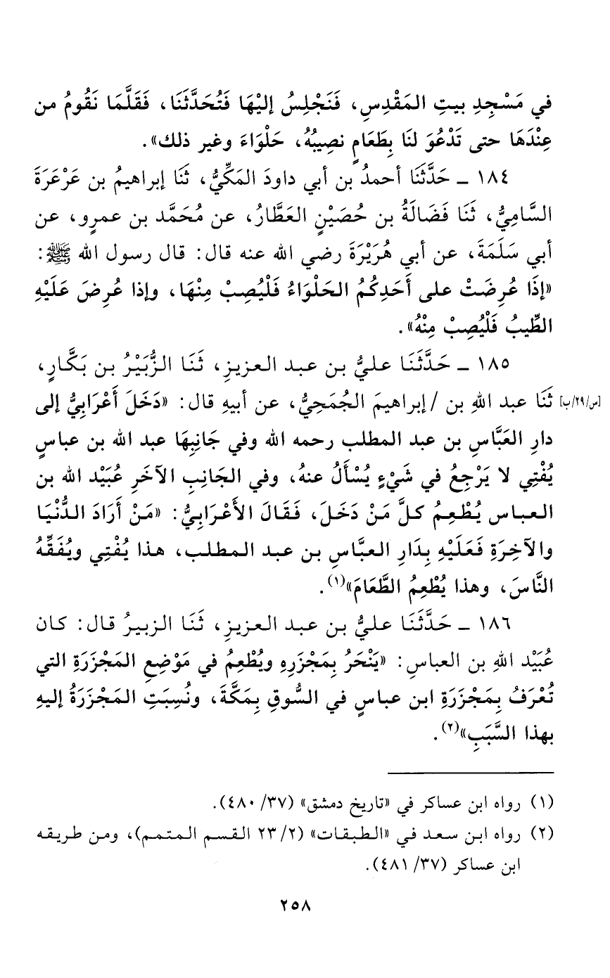 185 - حَدَّثَنَا عَلِيُّ بْنُ عَبْدِ الْعَزِيزِ، حَدَّثَنَا الزُّبَيْرُ بْنُ بَكَّارٍ، حَدَّثَنَا عَبْدُ اللَّهِ بْنُ إِبْرَاهِيمَ الْجُمَحِيُّ، عَنْ أَبِيهِ قَالَ: "دَخَلَ أَعْرَابِيٌّ إِلَى دَارِ الْعَبَّاسِ بْنِ عَبْدِ الْمُطَّلِبِ رَحِمَهُ اللَّهُ وَفِي جَانِبِهَا عَبْدُ اللَّهِ بْنُ عَبَّاسٍ يُفْتِي لَا يَرْجِعُ فِي شَيْءٍ يُسْأَلُ عَنْهُ، وَفِي الْجَانِبِ الْآخَرِ عُبَيْدُ اللَّهِ بْنُ الْعَبَّاسِ يُطْعِمُ كُلَّ مَنْ دَخَلَ، فَقَالَ الْأَعْرَابِيُّ: "مَنْ أَرَادَ الدُّنْيَا وَالْآخِرَةَ فَعَلَيْهِ بِدَارِ الْعَبَّاسِ بْنِ عَبْدِ الْمُطَّلِبِ، هَذَا يُفْتِي وَيُفَقِّهُ النَّاسَ، وَهَذَا يُطْعِمُ الطَّعَامَ".