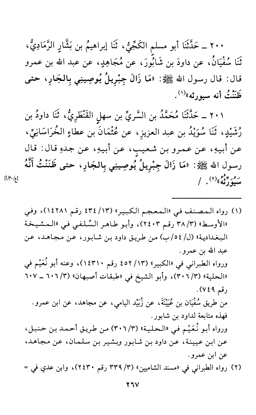 201 - حَدَّثَنَا مُحَمَّدُ بْنُ السَّرِيِّ بْنِ سَهْلٍ الْقَنْطَرِيُّ، حَدَّثَنَا دَاوُدُ بْنُ رُشَيْدٍ، حَدَّثَنَا سُوَيْدُ بْنُ عَبْدِ الْعَزِيزِ، عَنْ عُثْمَانَ بْنِ عَطَاءٍ الْخُرَاسَانِيِّ، عَنْ أَبِيهِ، عَنْ عَمْرِو بْنِ شُعَيْبٍ، عَنْ أَبِيهِ، عَنْ جَدِّهِ قَالَ: قَالَ رَسُولُ اللَّهِ صَلَّى اللَّهُ عَلَيْهِ وَسَلَّمَ: "مَازَالَ جِبْرِيلُ يُوصِينِي بِالْجَارِ، حَتَّى ظَنَنْتُ أَنَّهُ سَيُوَرِّثُهُ".