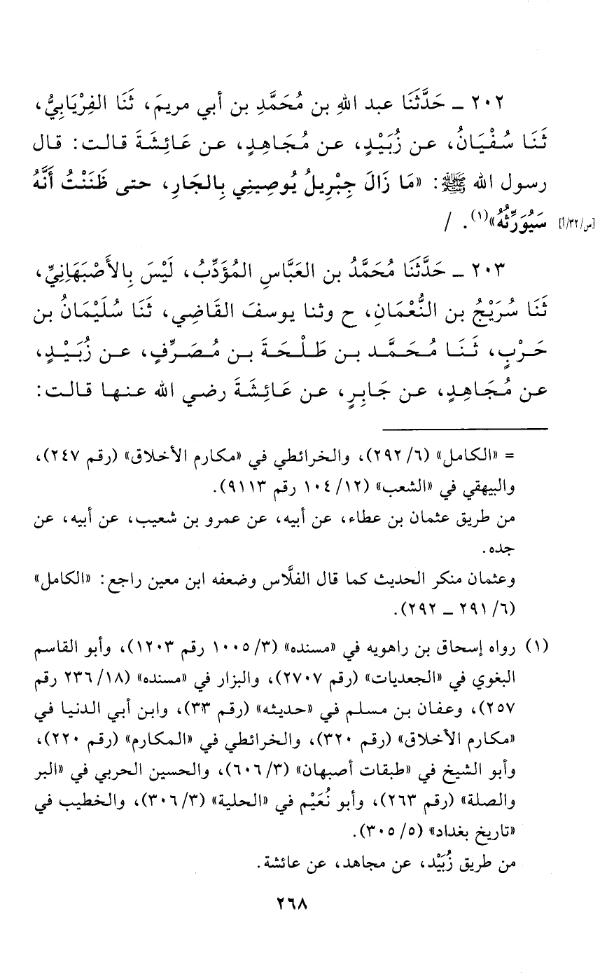 203 - حَدَّثَنَا مُحَمَّدُ بْنُ الْعَبَّاسِ الْمُؤَدِّبُ، لَيْسَ بِالْأَصْبَهَانِيِّ، حَدَّثَنَا سُرَيْجُ بْنُ النُّعْمَانِ (ح) وَحَدَّثَنَا أَبُو يُوسُفَ الْقَاضِي، حَدَّثَنَا سُلَيْمَانُ بْنُ حَرْبٍ، حَدَّثَنَا مُحَمَّدُ بْنُ طَلْحَةَ بْنِ مُصَرِّفٍ، عَنْ زُبَيْدٍ، عَنْ مُجَاهِدٍ، عَنْ جَابِرٍ، عَنْ عَائِشَةَ رَضِيَ اللَّهُ عَنْهَا قَالَتْ: قَالَ رَسُولُ اللَّهِ صَلَّى اللَّهُ عَلَيْهِ وَسَلَّمَ: "مَازَالَ جِبْرِيلُ يُوصِينِي بِالْجَارِ، حَتَّى ظَنَنْتُ أَنَّهُ سَيُوَرِّثُهُ".