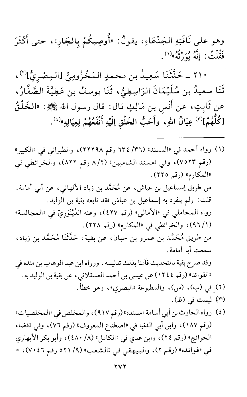 210 - حَدَّثَنَا سَعِيدُ بْنُ مُحَمَّدٍ الْمَخْزُومِيُّ المصري، حَدَّثَنَا سَعِيدُ بْنُ سُلَيْمَانَ الْوَاسِطِيُّ، حَدَّثَنَا يُوسُفُ بْنُ عَطِيَّةَ الصَّفَّارُ، عَنْ ثَابِتٍ، عَنْ أَنَسِ بْنِ مَالِكٍ قَالَ: قَالَ رَسُولُ اللَّهِ صَلَّى اللَّهُ عَلَيْهِ وَسَلَّمَ: "الْخَلْقُ كُلُّهُمْ عِيَالُ اللَّهِ، وَأَحَبُّ الْخَلْقِ إِلَيْهِ أَنْفَعُهُمْ لِعِيَالِهِ".